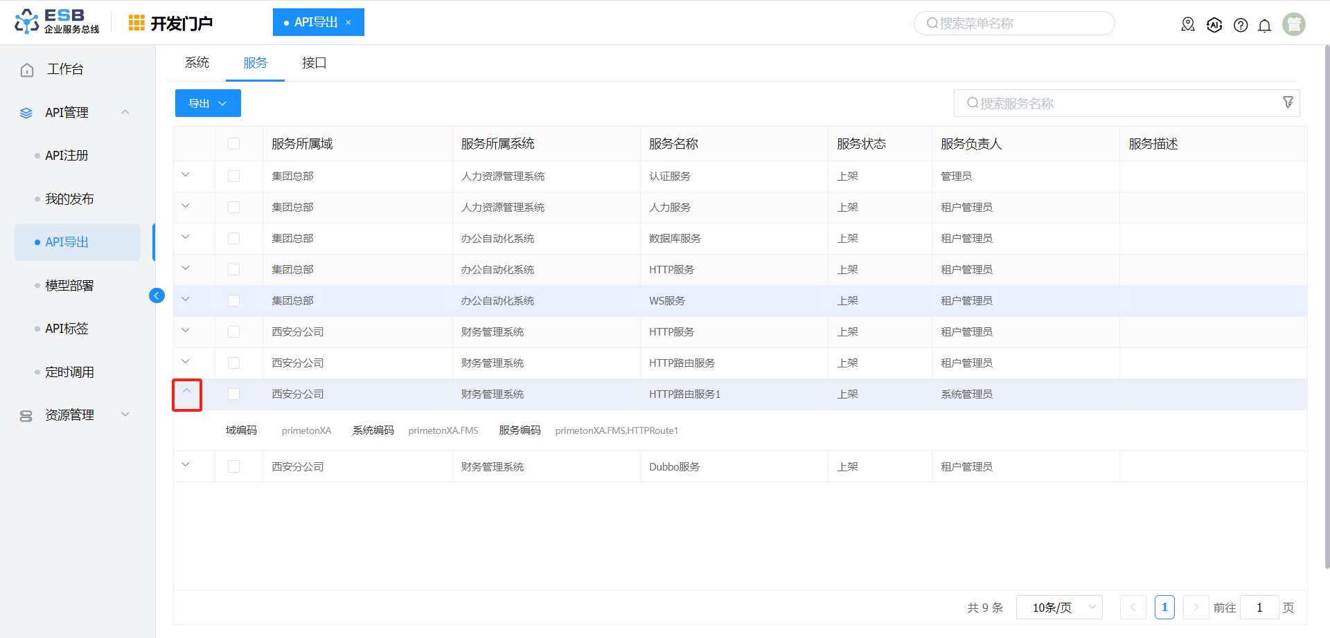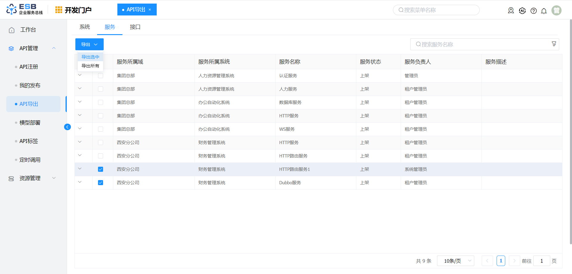 开发人员登录系统,进入开发门户,单击左侧导航树上的 “API管理 > API导出”, 右侧区域显示 “API导出” 界面。。选择“服务”标签页,显示所有接口服务,也可以模糊查询特定接口服务。 点击导出按钮可导出全部数据或部分数据。