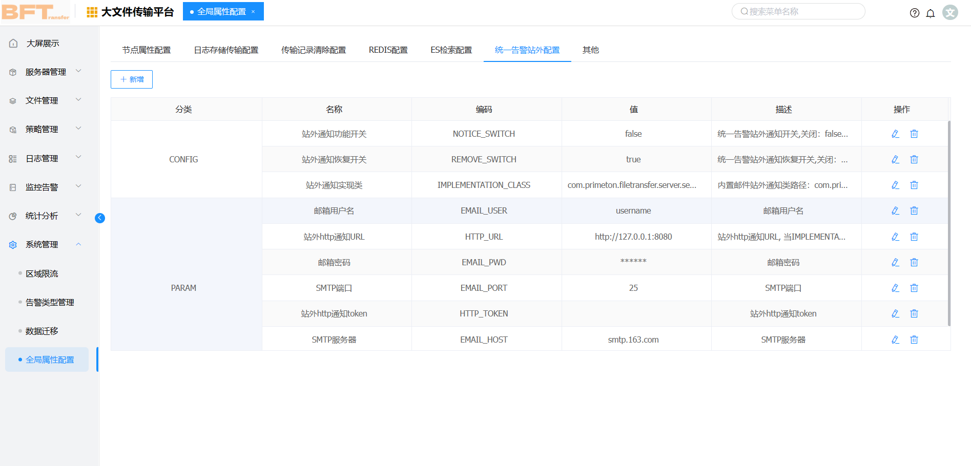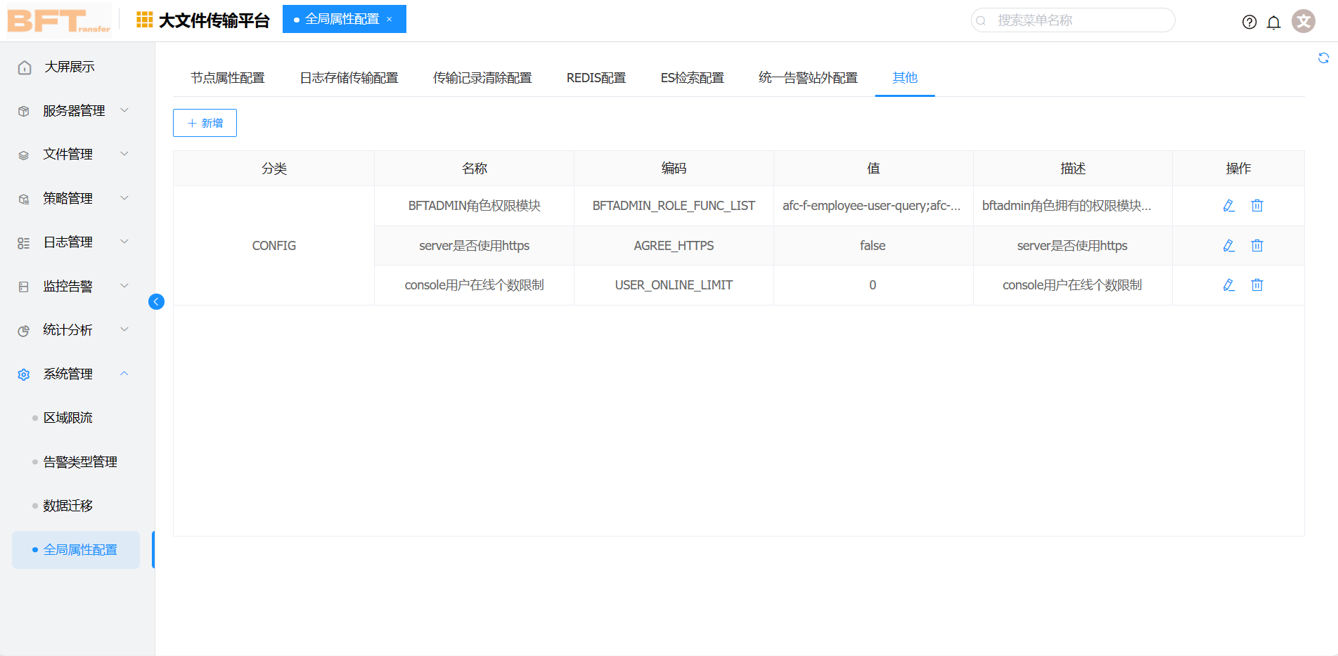 在BFT Console中点击菜单【系统管理】>【全局属性配置】,右侧区域显示 "全局属性配置" 界面: