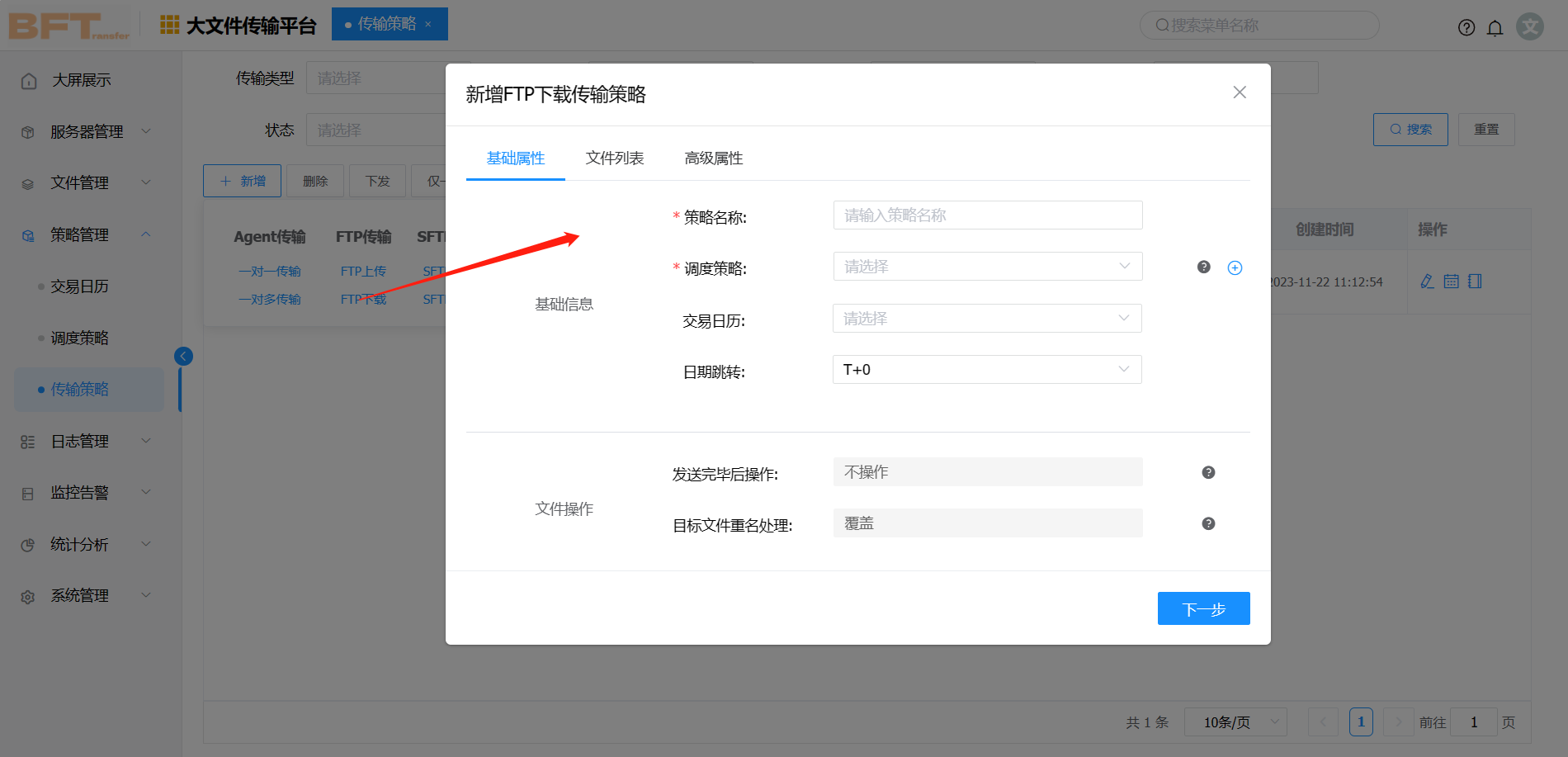 点击【新增】按钮, 选择【FTP下载】,配置传输策略。
