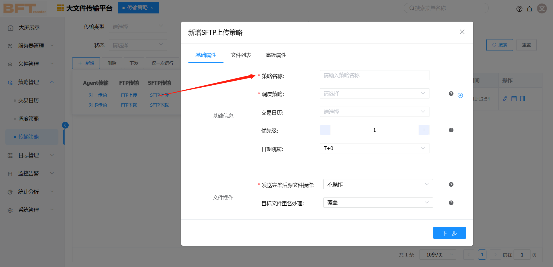 点击【新增】按钮, 选择【SFTP上传】,配置传输策略。