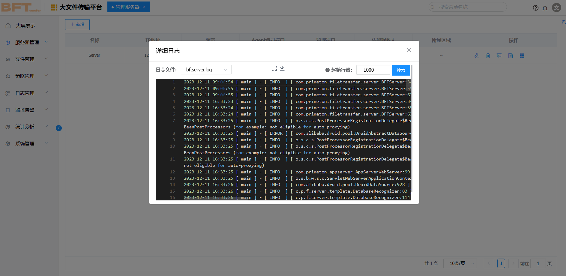 在控制管理中心进入菜单【服务器管理】>【管理服务器】,点击【查看日志】按钮,查看管理服务系统日志