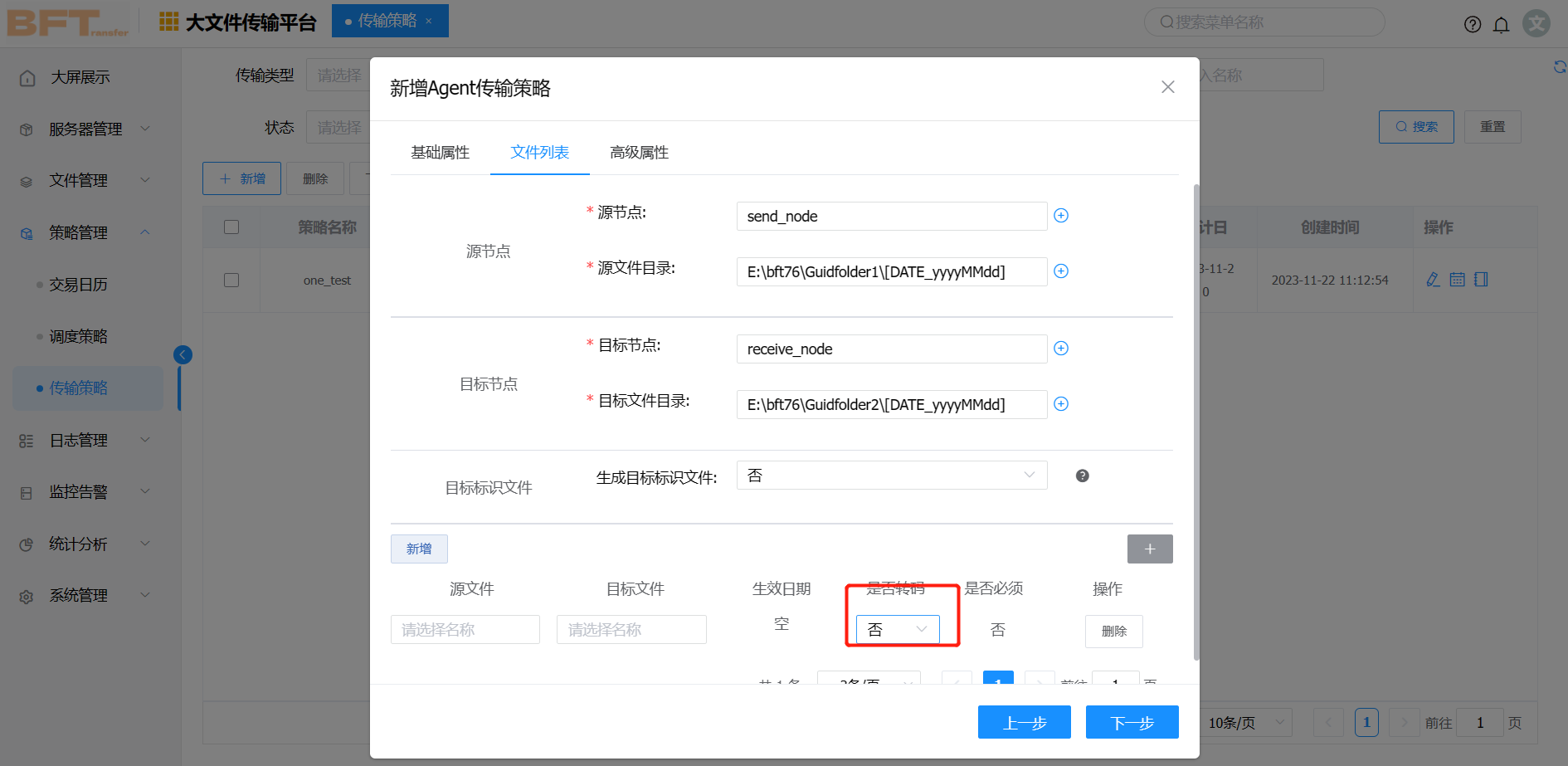 使用转码传输的前提为,传输策略中传输的文件编码格式不一致,是否转码选项选择为“是”