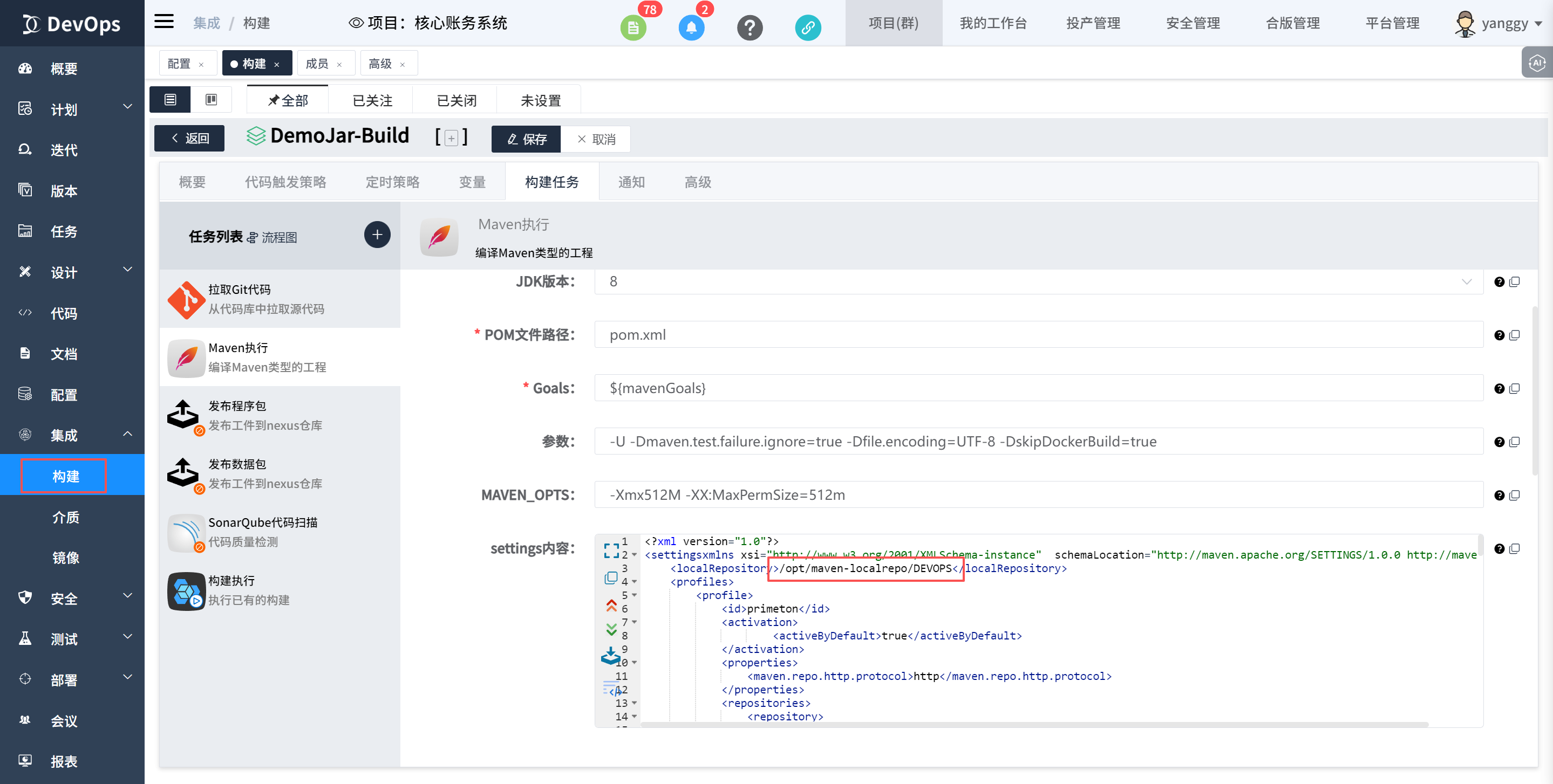 以maven构建原子任务为例,在maven构建任务中可以配置setting文件内容,将预设的locaRepo目录填写到文件内容中。