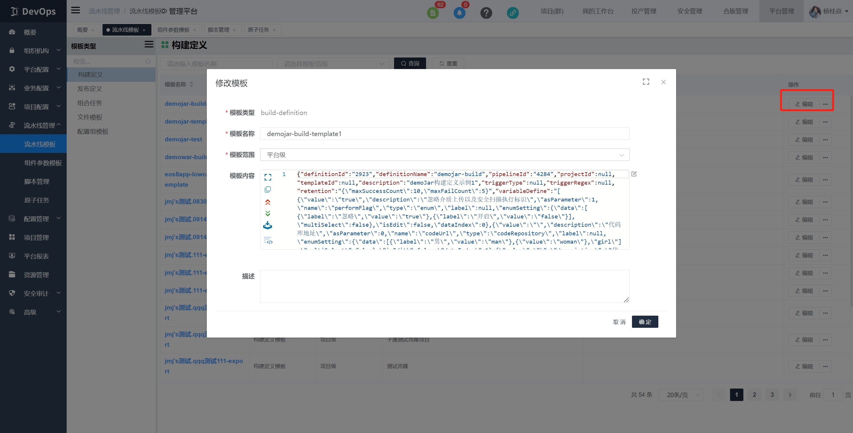 在 DevOps 的流水线模板功能菜单页中,支持对构建定义、发布定义以及文件模板这三种类型的模板进行维护管理。