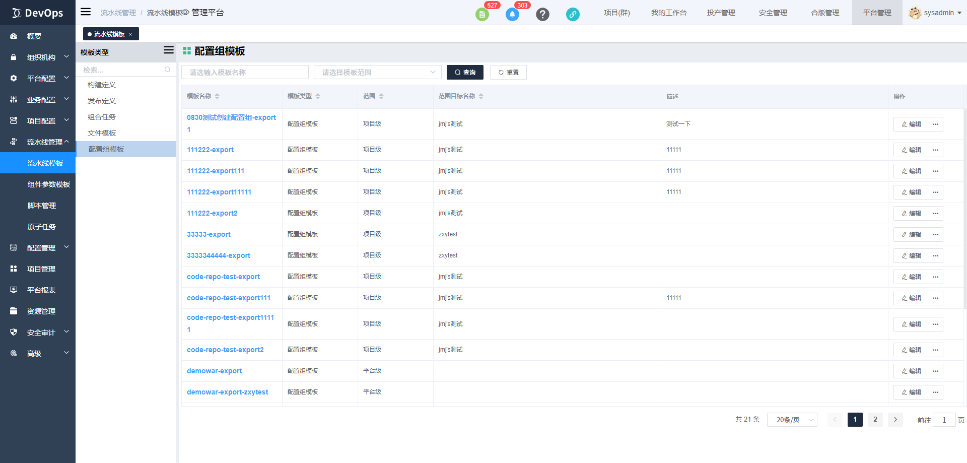 模板使用范围分为项目级和平台级。若一个模板供多个项目使用,可将此模板的使用范围设置成平台级。
