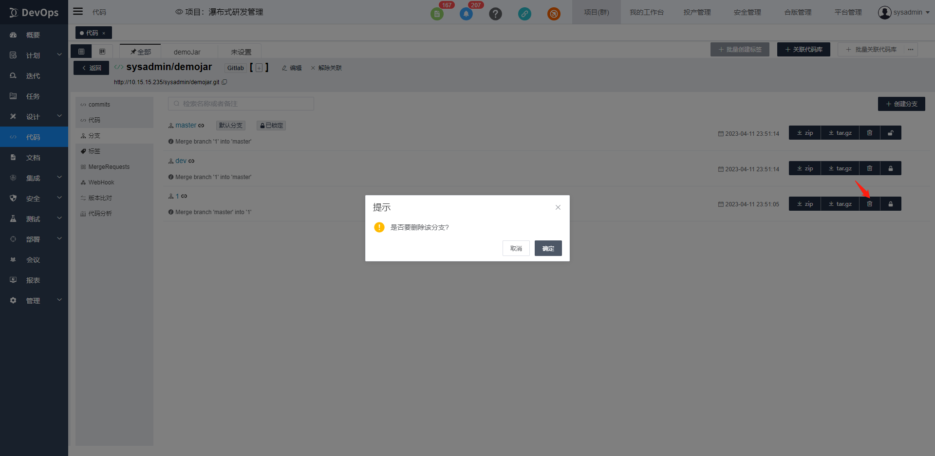 DevOps项目管理中的代码库模块支持将Gitlab、Gihub、Bitbucket、Svn、Tfs关联至项目,并集成了高频功能,方便用户对代码库进行管理,支持对代码库打标签。
