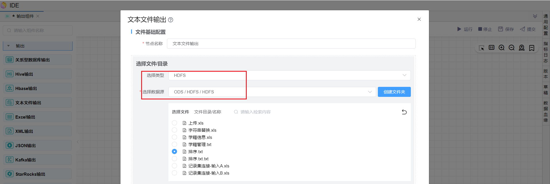 选择类型为HDFS。如下配置代表在HDFS的根目录下生成a.txt文件。