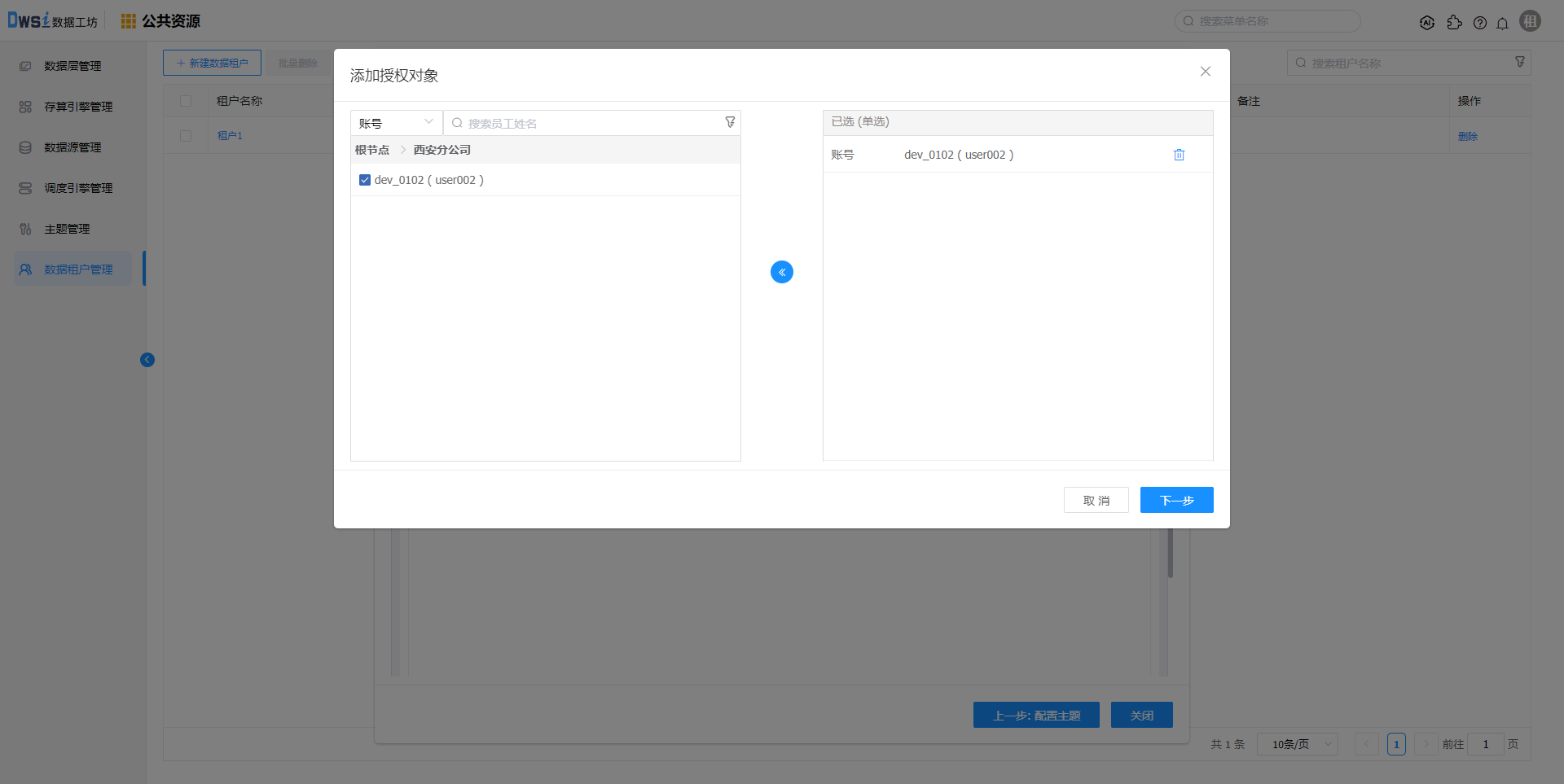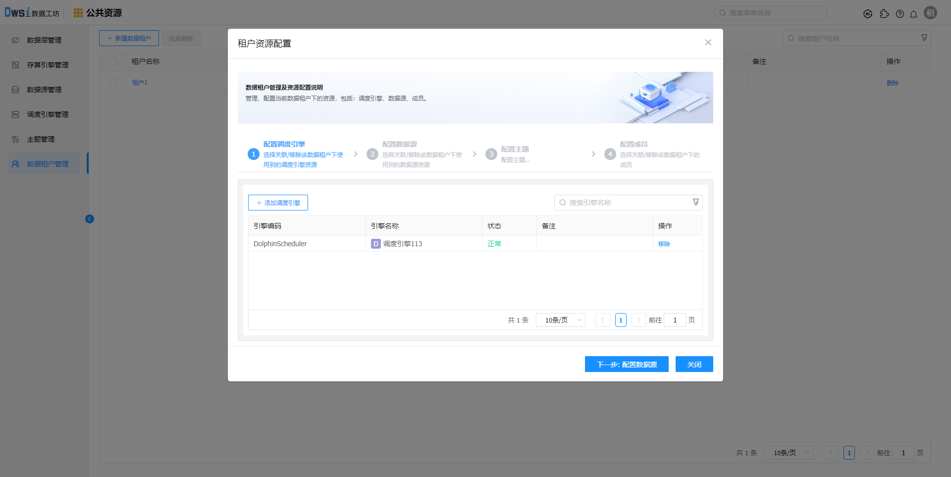 在弹出的【租户资源配置】页面,依次配置调度引擎、数据源、主题、成员