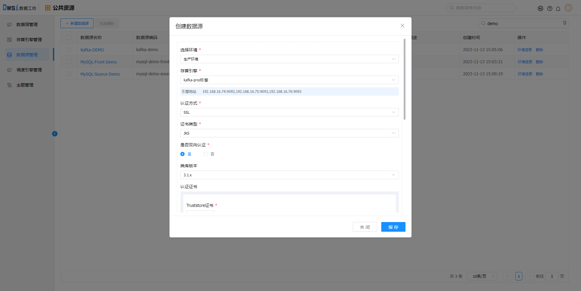 点击上方菜单栏“公共资源”,进入公共资源管理界面,点击菜单栏的"存算引擎管理",进入存算引擎管理界面。在【存算引擎管理】页面,点击"新建存算引擎"按钮。