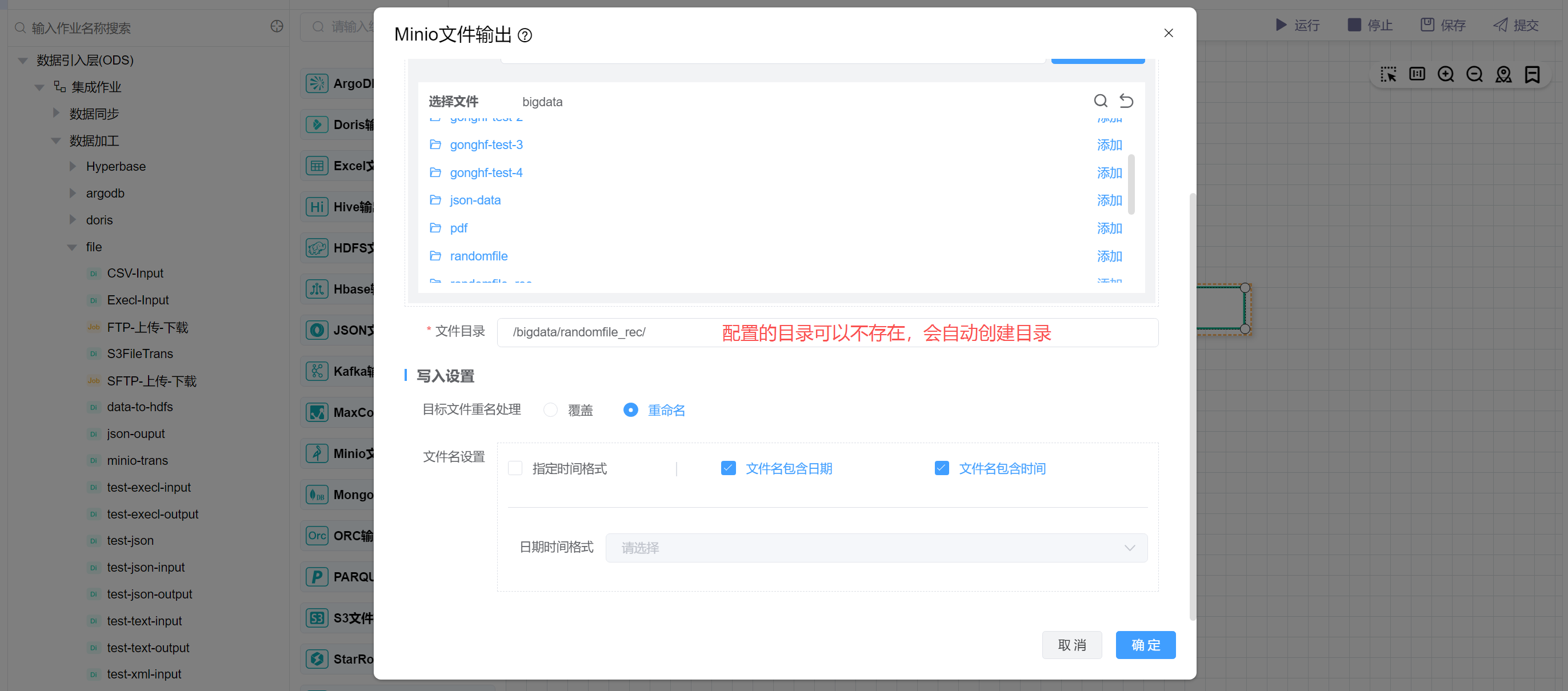 配置文件目录为/bigdata/randomfile_rec,设置文件重名处理为重命名,重命名后的文件包含日期和时间。然后点击确定。