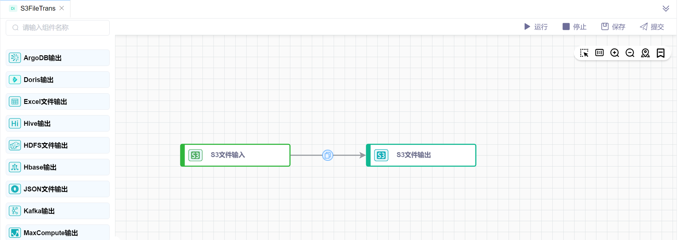 依次拖拽输入中的S3文件输入组件、输出中的S3文件输出组件,依次连线。如下图所示: