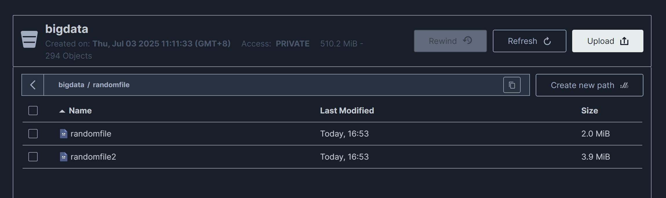 将randomfile、randomfile2文件上传到s3://bigdata/randomfile/下: