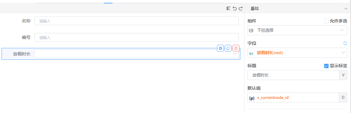 前提:先加载<假日时长>表单,更新视图,并添加视图数据;再更新<节假日>表单,其中控件<放假时长>为下拉框,数据来源绑定的是<假日时长>的实体