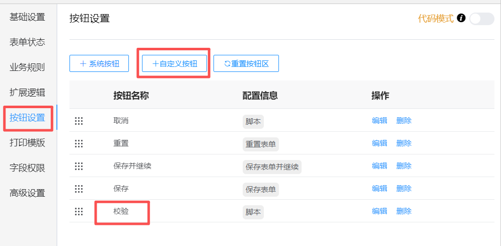 对自定义按钮进行编辑,名称改为“校验”,添加动作代码块,调用表单校验接口。