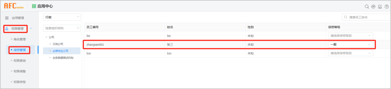1. 租户管理员登录系统后,在应用中心-权限管理-保密管理中,找到对应的员工,设置保密等级,如下图所示: