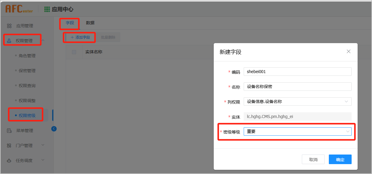 2. 点击权限管理-权限密级,点击字段-添加字段,在列权限中找到需要设置的列,设置密级等级,并填写其他页面字段。点击确定保存。
