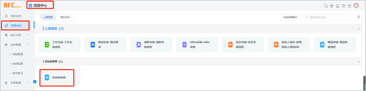 被授权的对象在流程中心-流程发起中,可以看到对应的流程并可以启动流程。