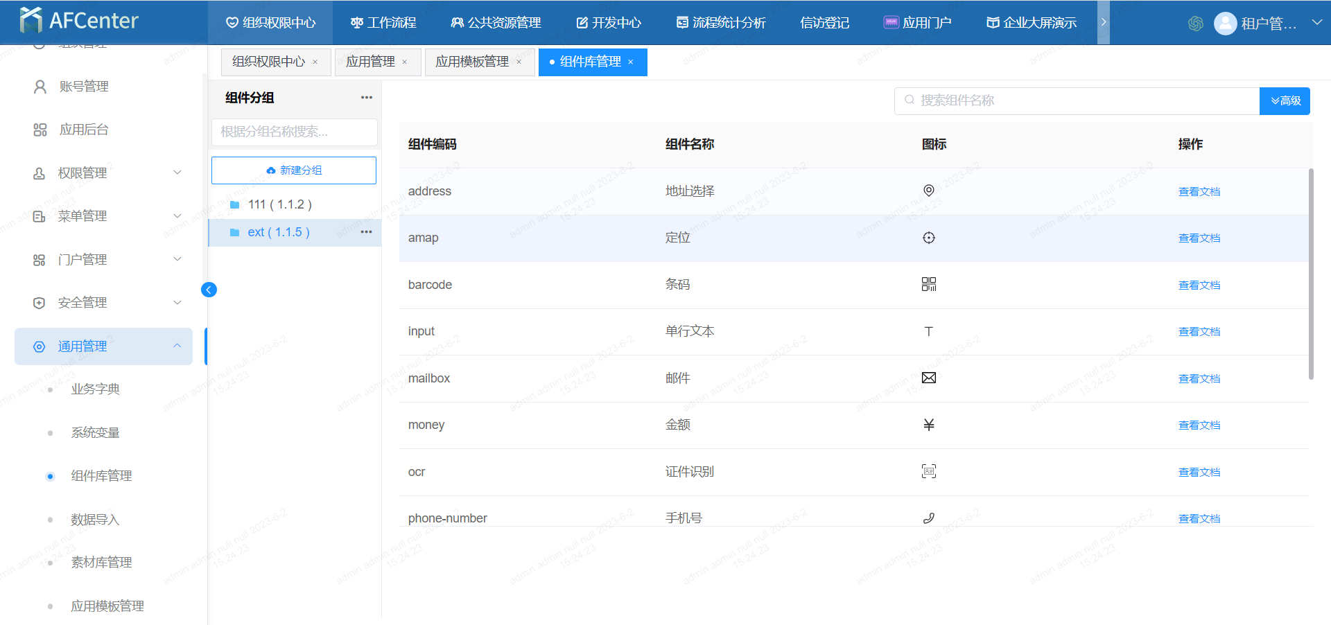 1.打开AFCenter组件库功能页面,新建分组,输入分组名上传扩展组件包。点击确认稍等后台上传解析成功即可。