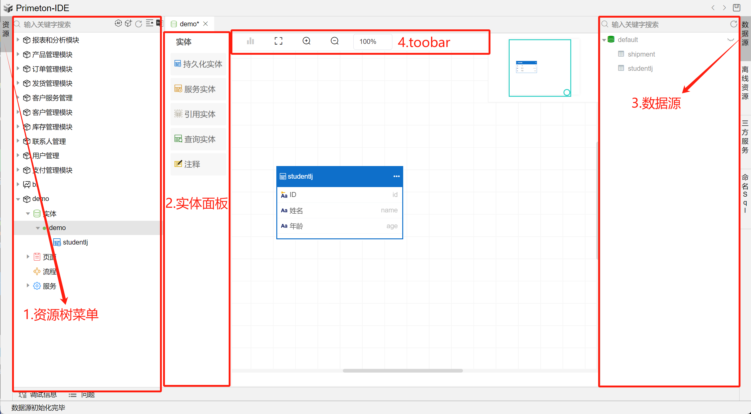 实体界面主要分为4部分:资源树菜单,实体面板,数据源,toolbar。