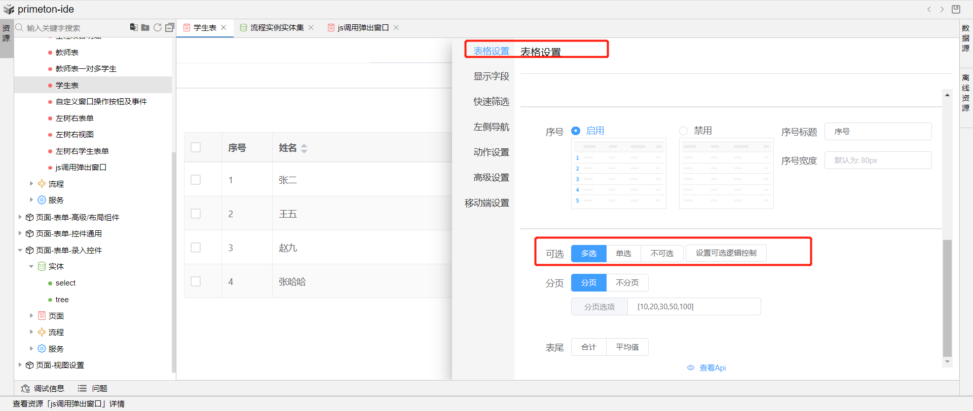1.在学生表单中新建一个学生默认视图2,打开视图设置,点击表格设置中多选设置,切换为多选模式。