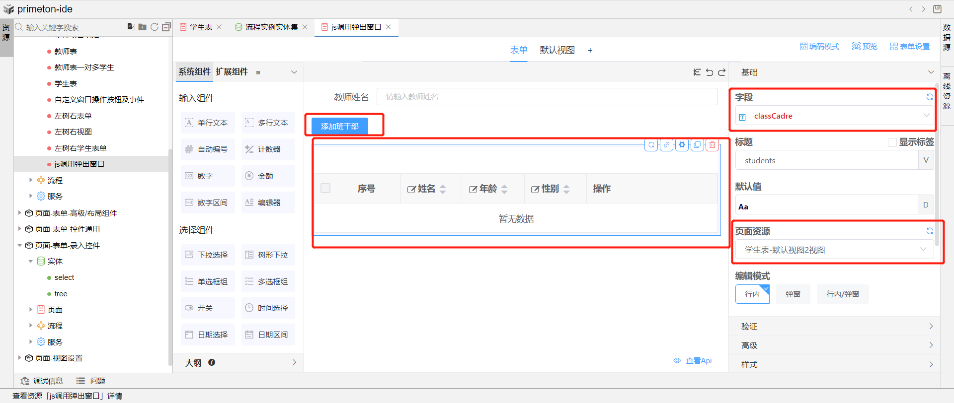 2.根据教师持久化实体创建一个录入班干部的审批表单,表单中拖入子表格绑定刚刚创建的学生视图;将子表格属性字段命名classCadre.