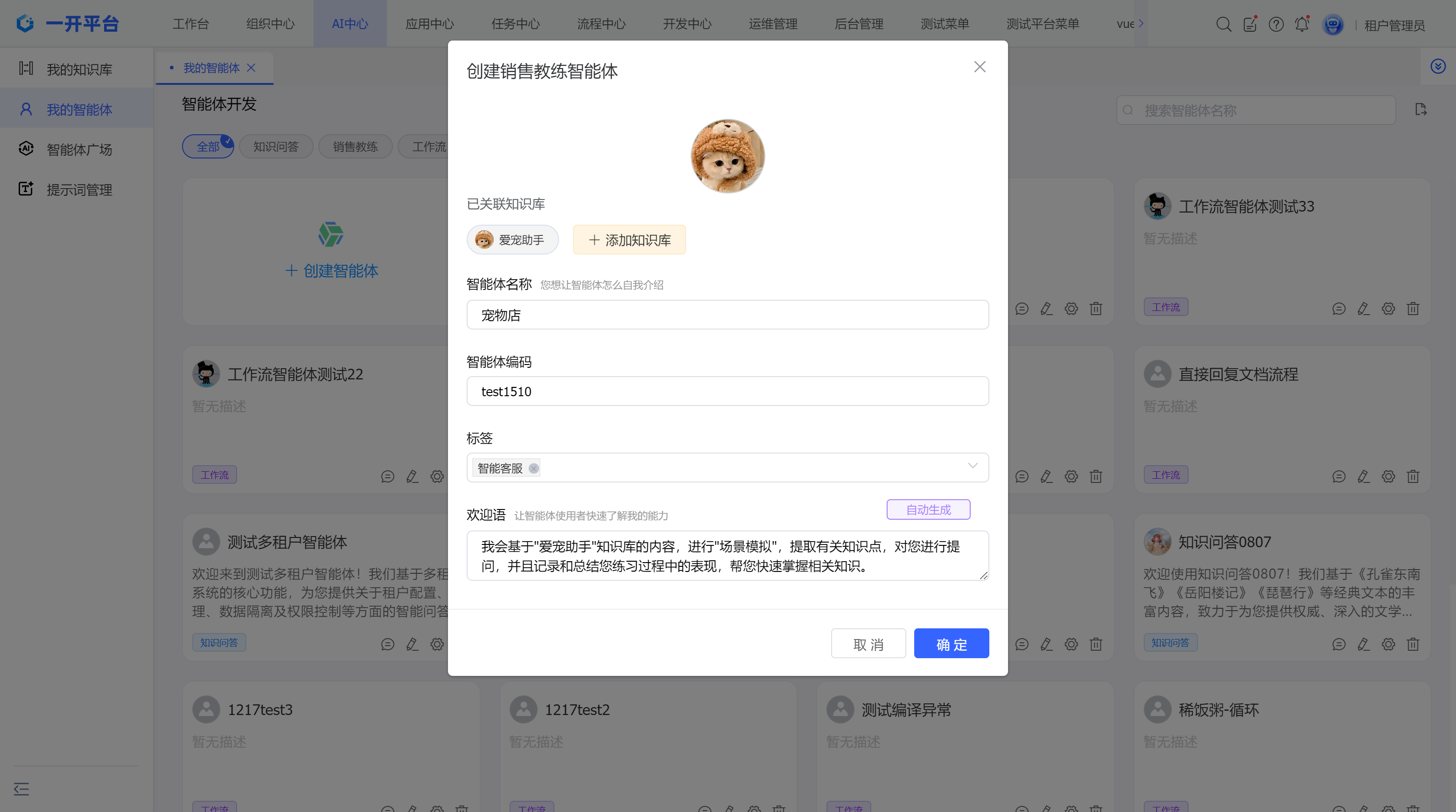 - 点击【自动生成】按钮,系统将根据智能体名称自动生成欢迎语