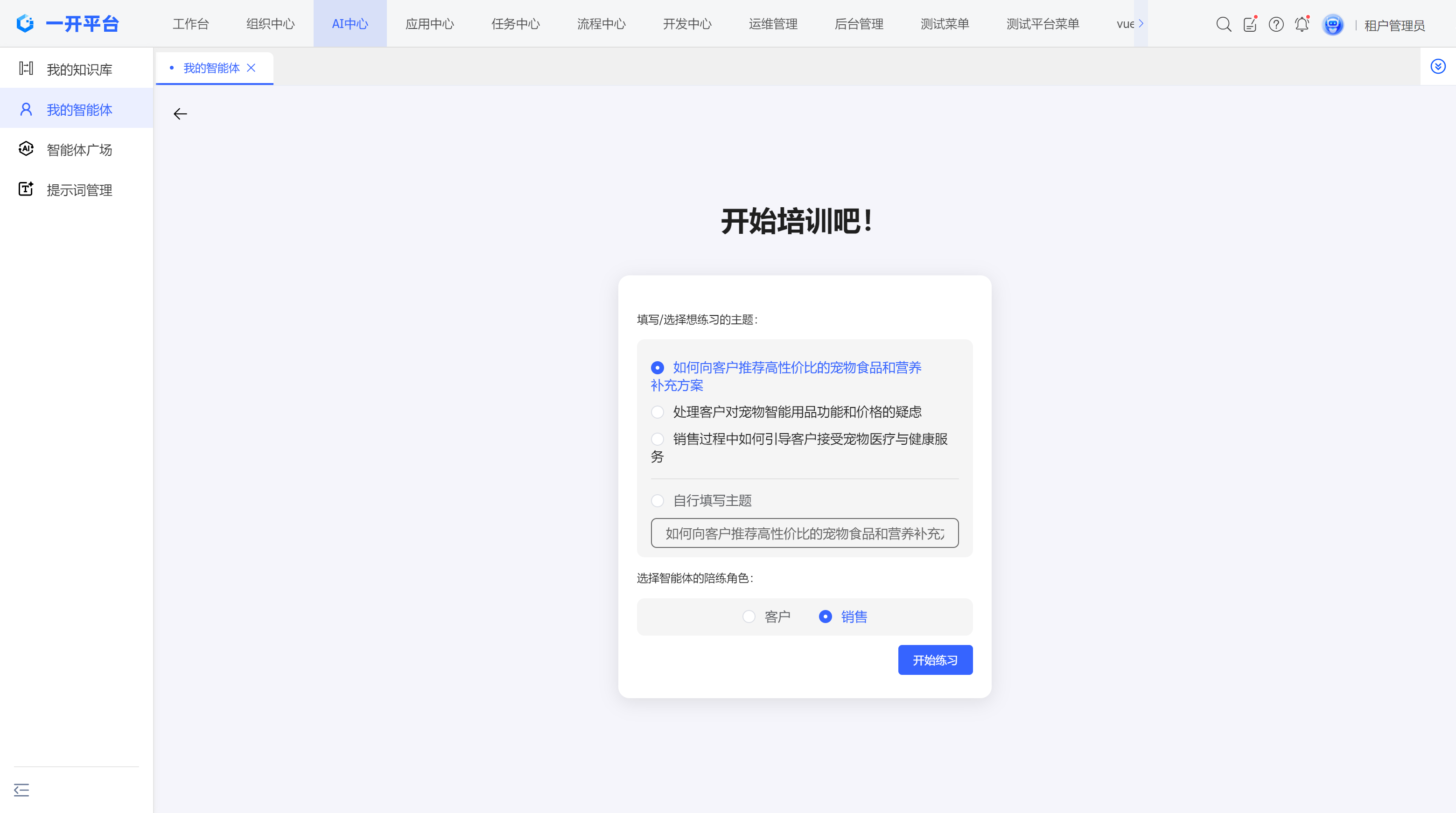 - 选择陪练角色:客户(模拟购买方)或销售(模拟同行协作)