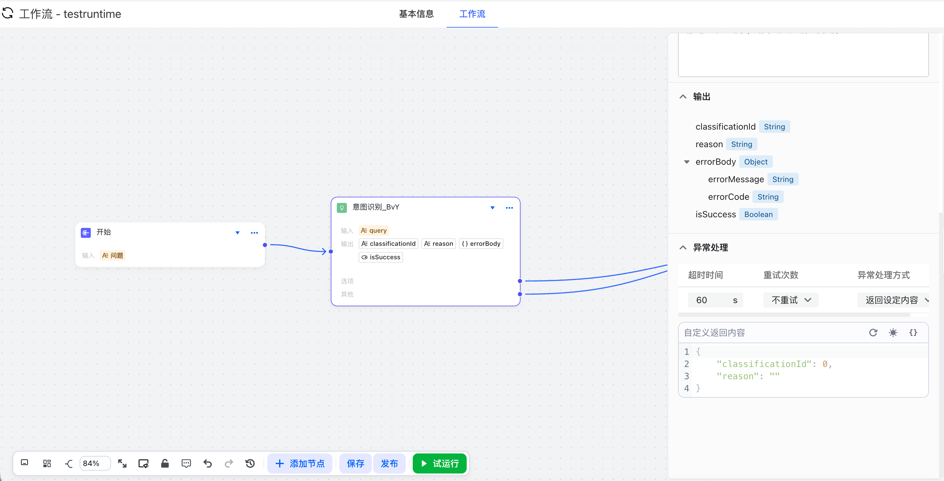 | 异常处理方式 | 选择发生异常后的流程走向: - 中断流程:(默认)停止工作流。 - 返回设定内容:不中断流程,而是返回一个你预先定义好的JSON格式结果。 - 执行异常流程:不中断流程,转而执行一个独立的异常处理分支,你可以在该分支中定义具体的补救措施。 |