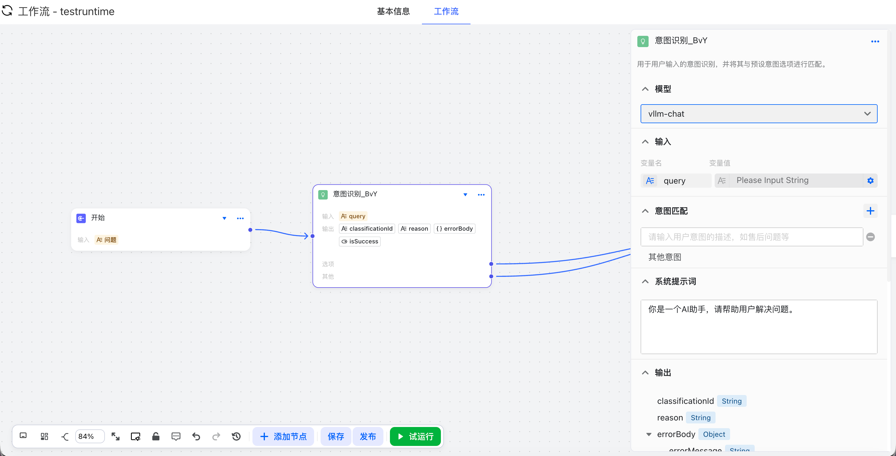 - 连接意图分支:你必须将意图识别节点上定义的每一个意图分类,都连接到后续相应的处理节点。例如,将“产品咨询”意图连接到产品知识库节点。