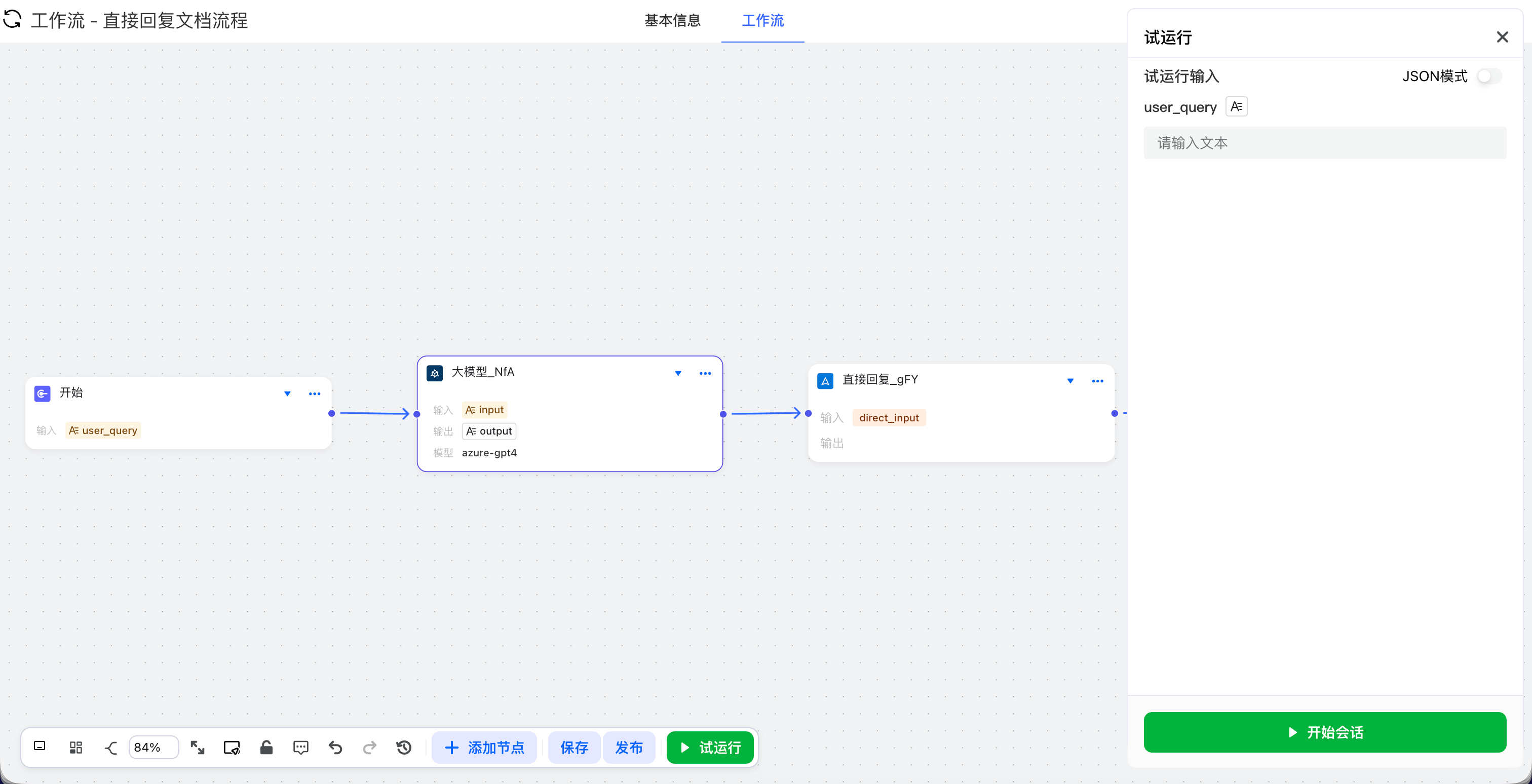 开启对话流参数后,不会立即回复,会把第一次的用户输入作为USER_INPUT参数值。在节点的输入变量可以选择USER_INPUT变量,如在大模型的节点中使用