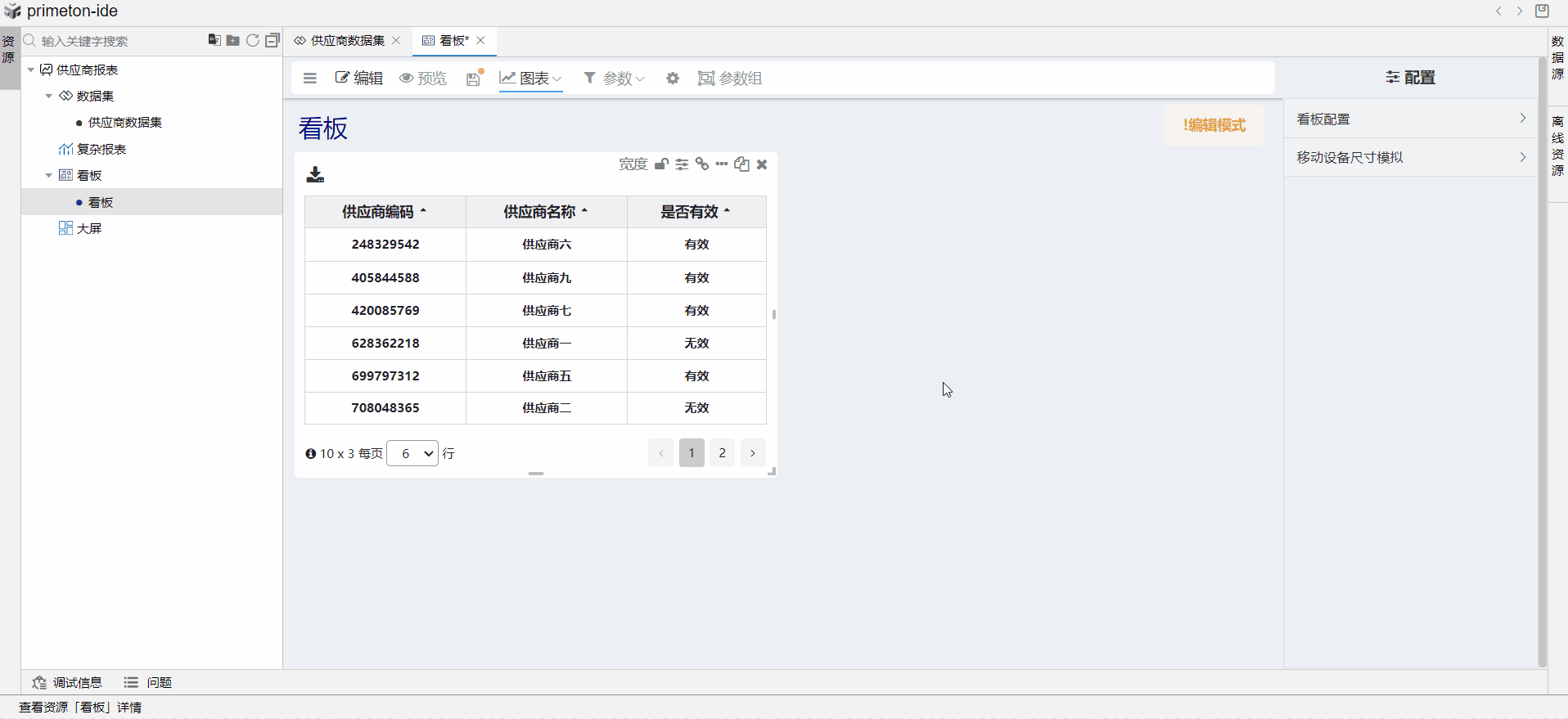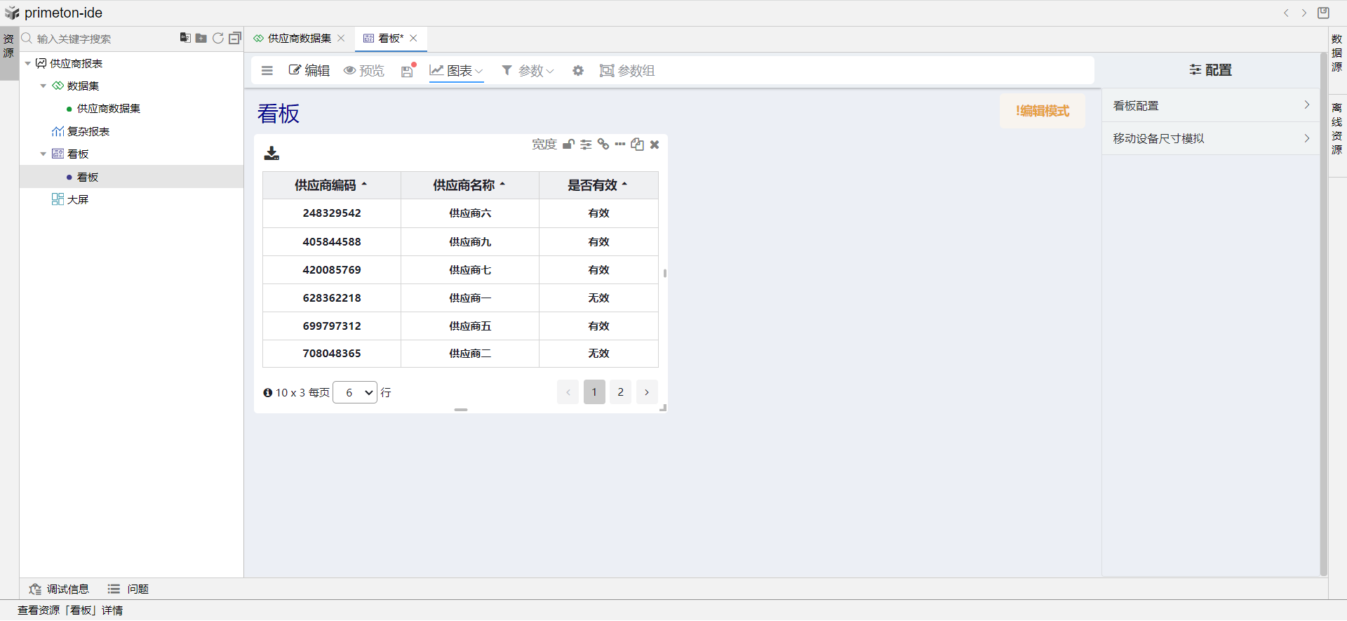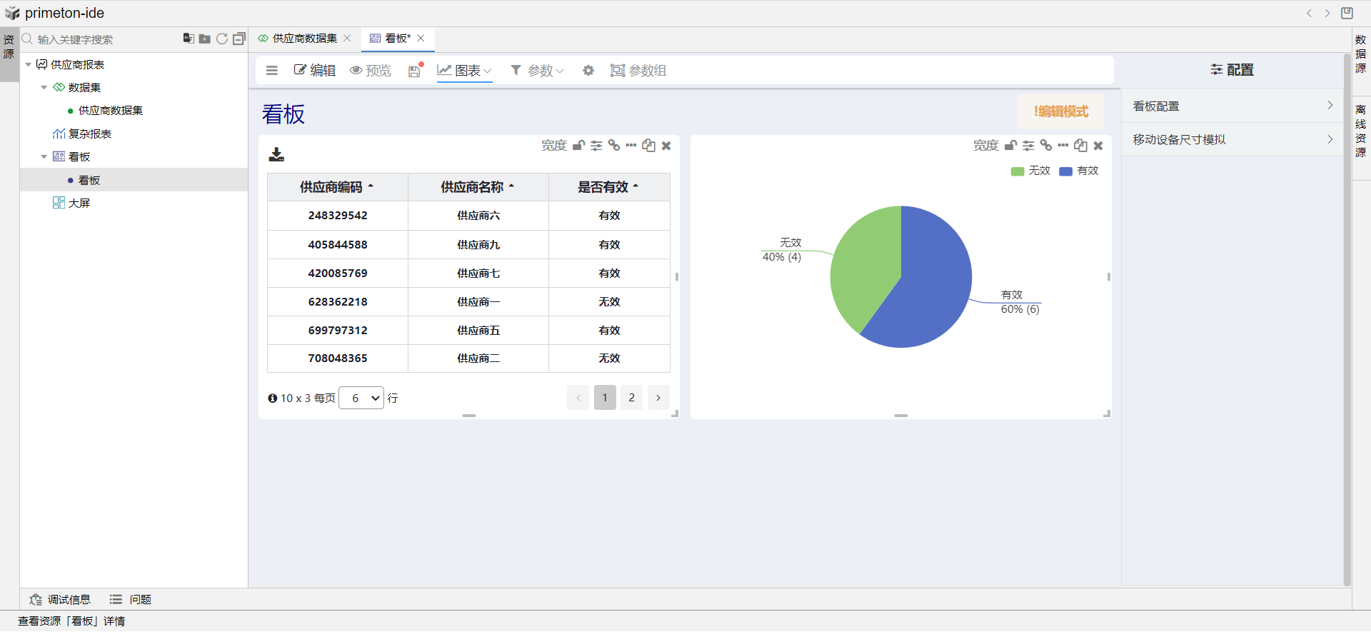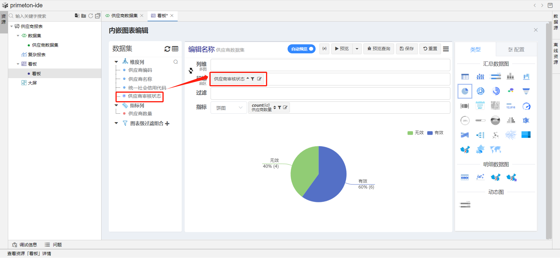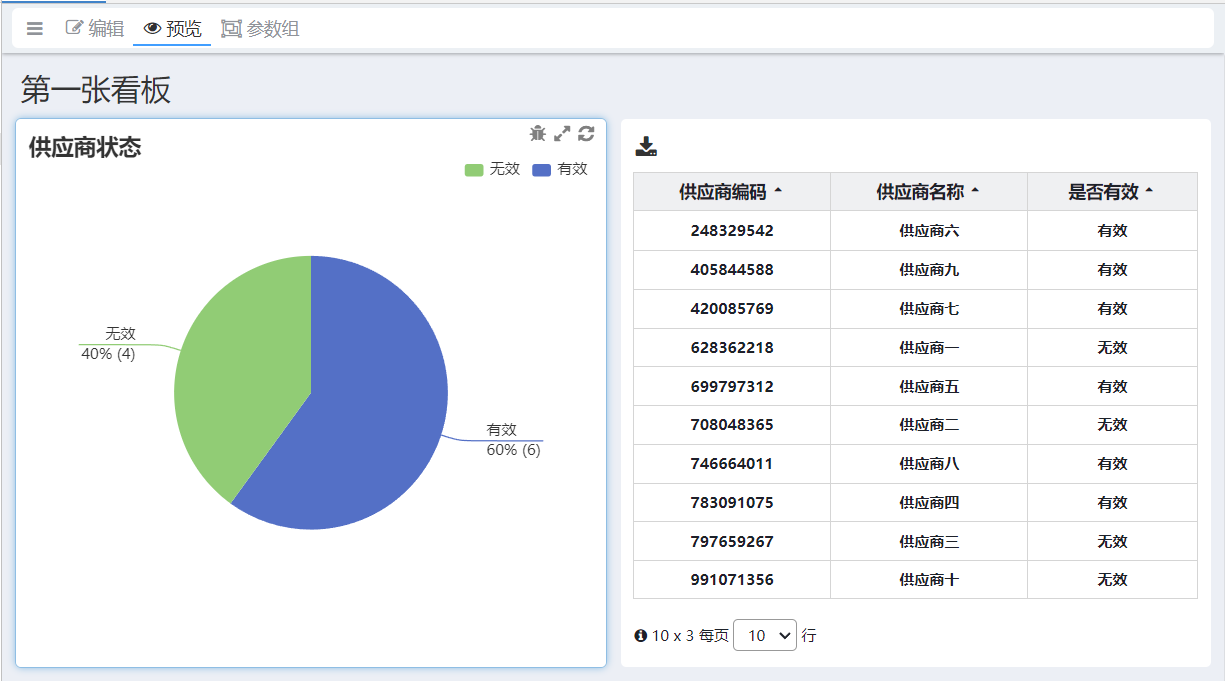 供应商表有个“状态”字段,“状态”分为有效与无效,本文以“状态”字段为例,讲解如何设计看板,并在看板中设计表格和图表来展示供应商“状态”的汇总结果。