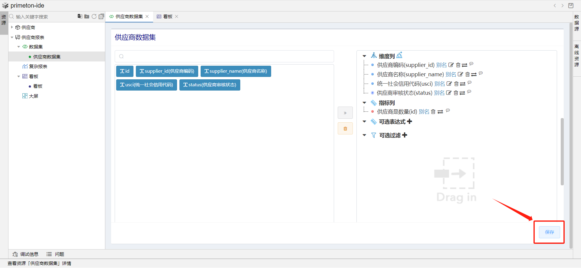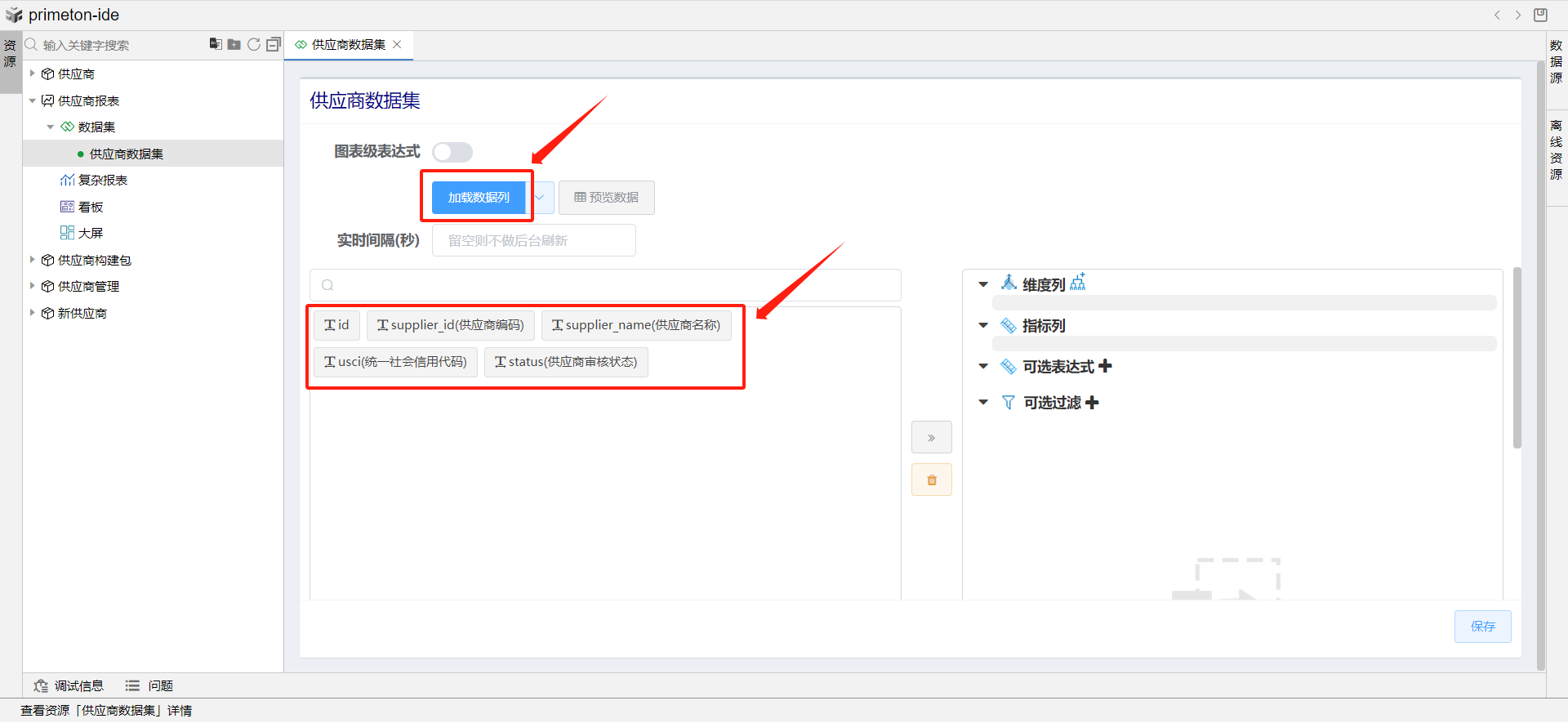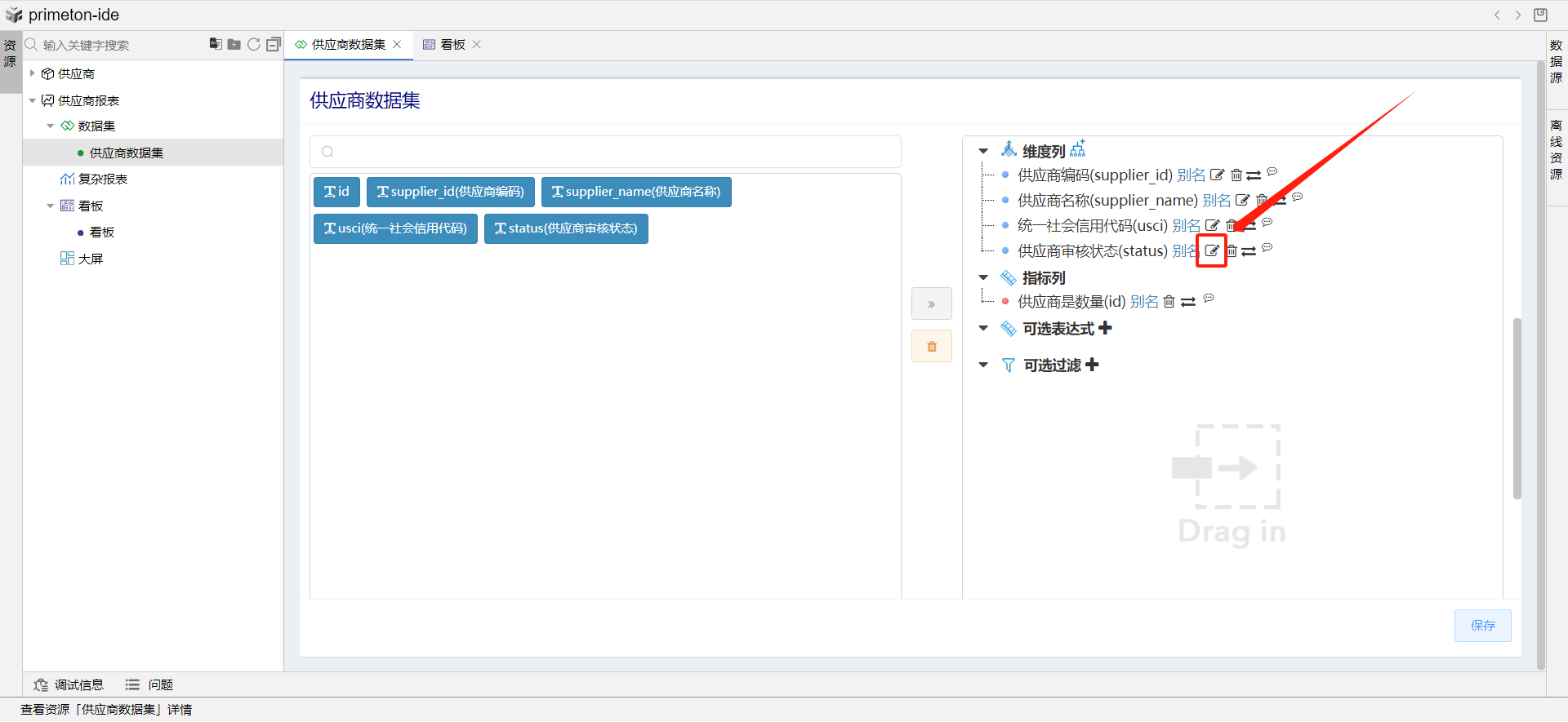 添加维度列和指标列,并修改指标列id别名为供应商数量。