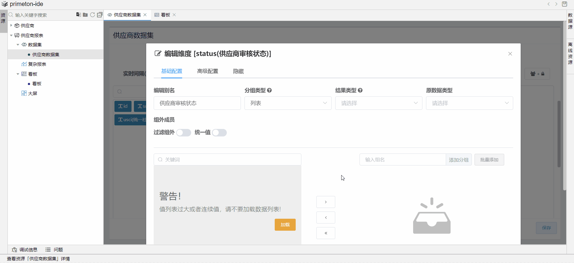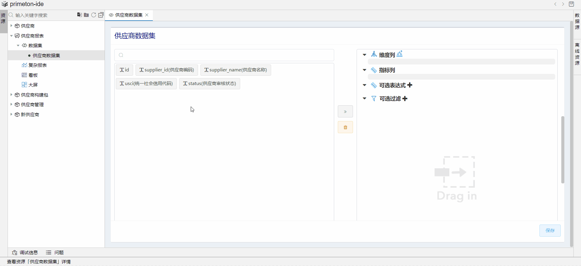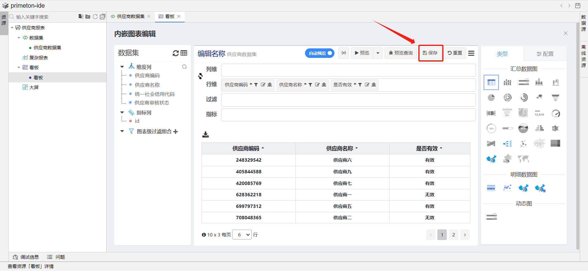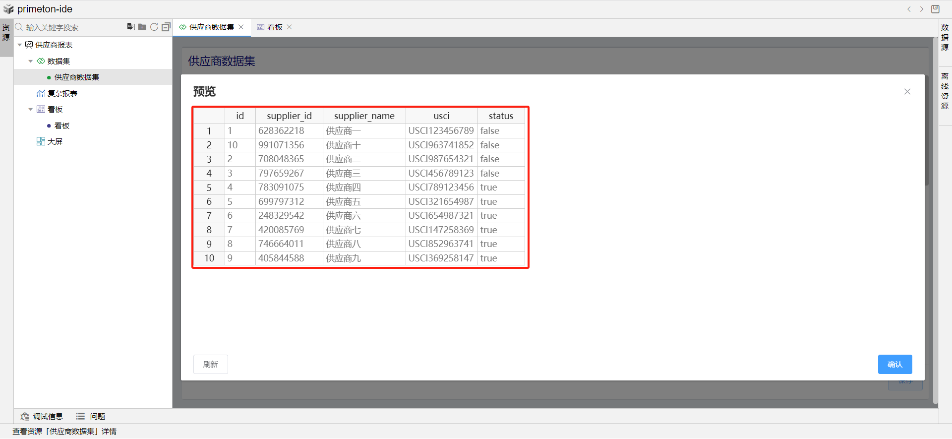 此时供应商审核状态在显示时就被定制为有效与无效了。最后点击保存,数据集创建完成。