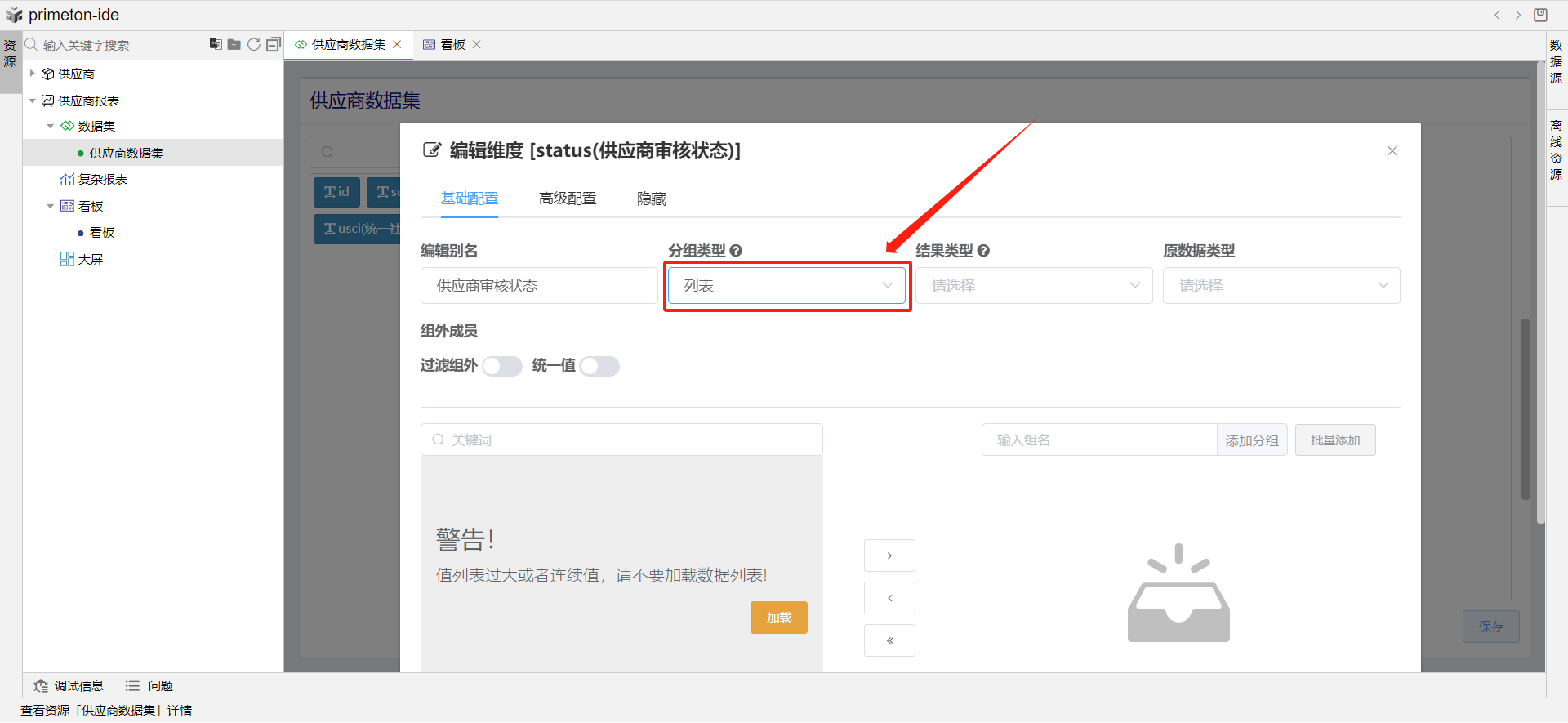 定制维度列表:数据库的供应商状态表字段为TINYINT数据类型(1,0),后续页面显示自动转换为布尔型true和false,要想达到预期效果显示的有效和无效,需要对供应商审核状态的维度列进行定制。