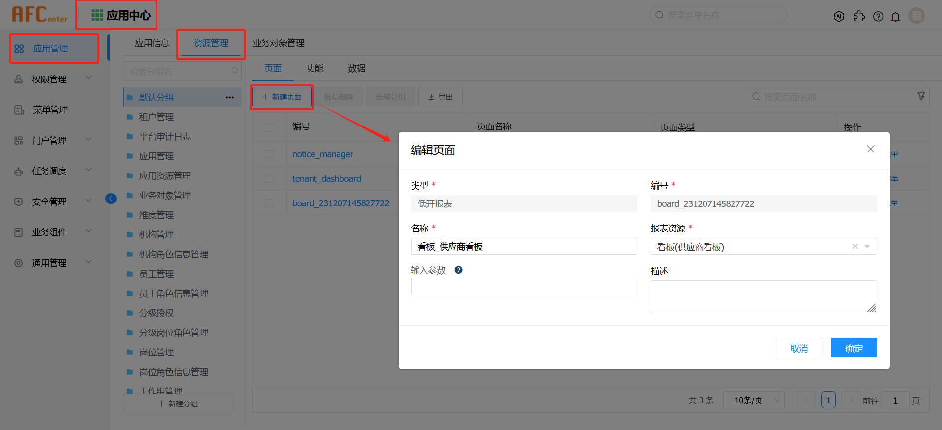在应用中心-应用管理界面中,选择开发完成的应用,进入资源管理界面,点击新建页面。在新建页面的弹出框中,选择页面类型为低开报表,选择看板资源,编辑其他信息,点击确定。