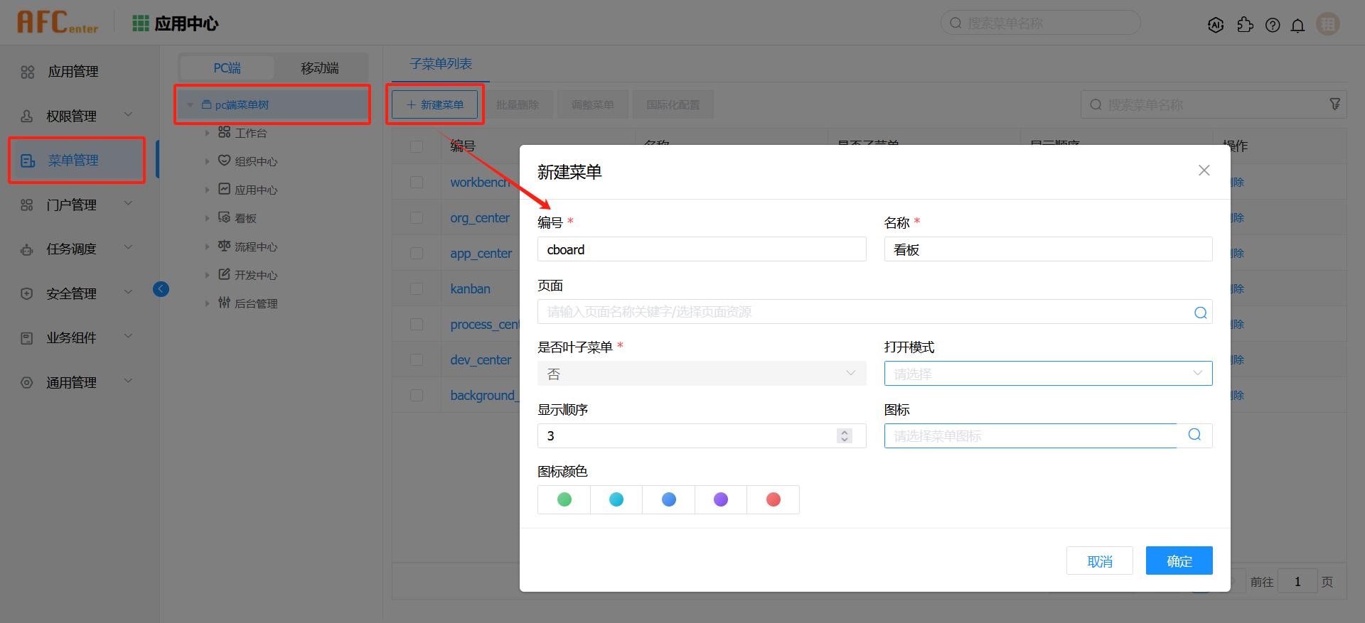在应用中心-菜单管理-PC端菜单树下,创建一个看板菜单。