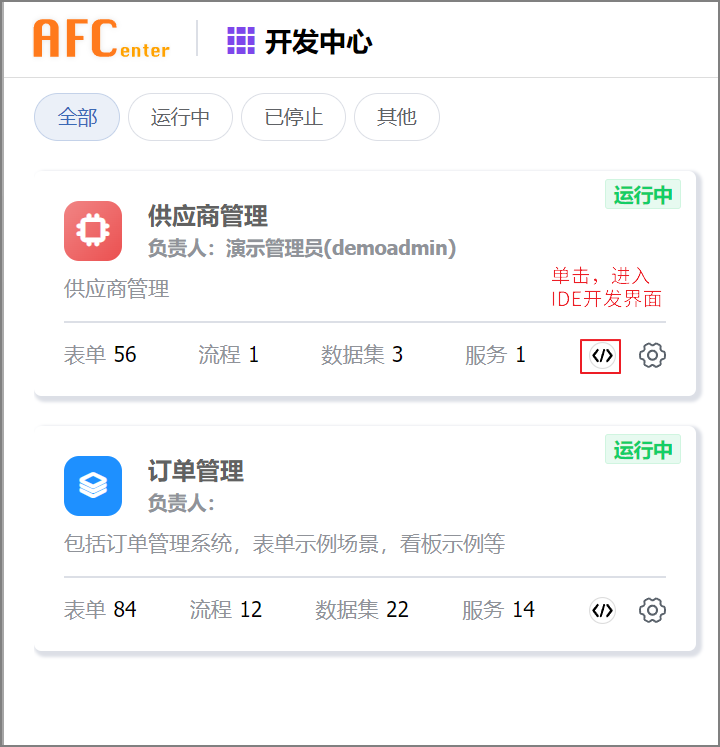 启动EOS后,在页面上方单击开发中心选项卡,找到需要开发的应用,再点击该应用的开发按键,进入低开开发页面。