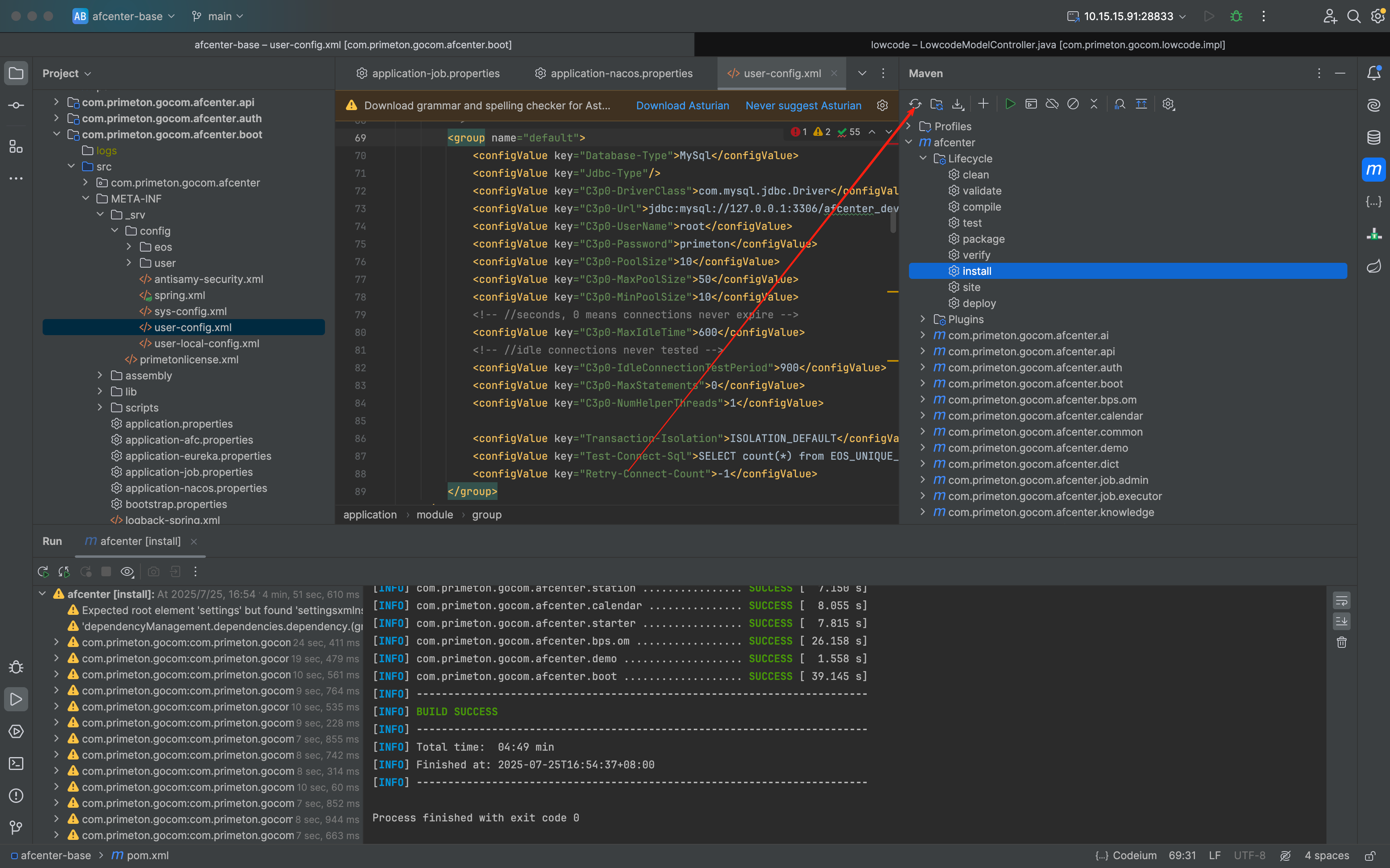 maven工具操作区中打开afcenter项目目录,Lifecycle中依次次点击clean,install编译项目;