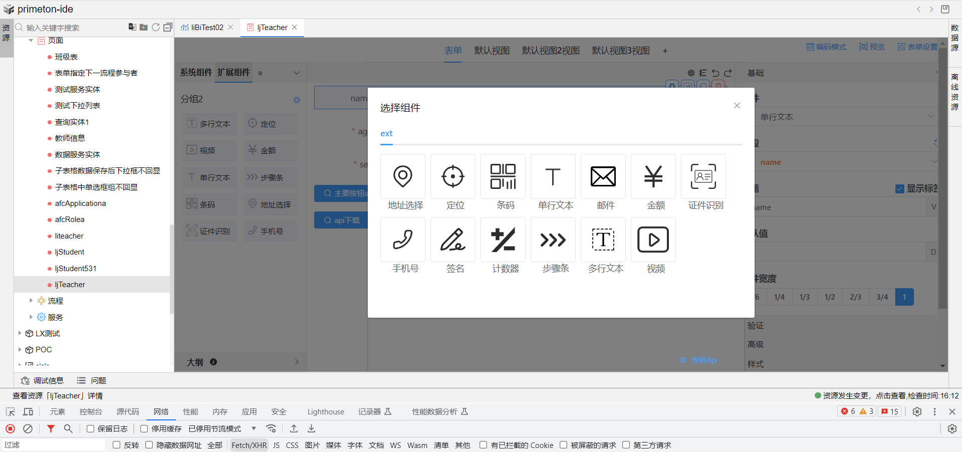 3.打开IDE的表单编辑器页面,选择扩展组件tab页,点击编辑扩展组件面板图标,打开扩展组件面板编辑弹窗新建,点击添加分组按钮。
