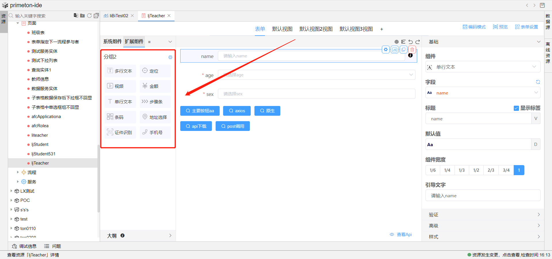 4.创建分组后在分组下方点击添加组件,选择我们要添加的组件点击即可完成添加,就可以在扩展组件面板就行拖选扩展组件。