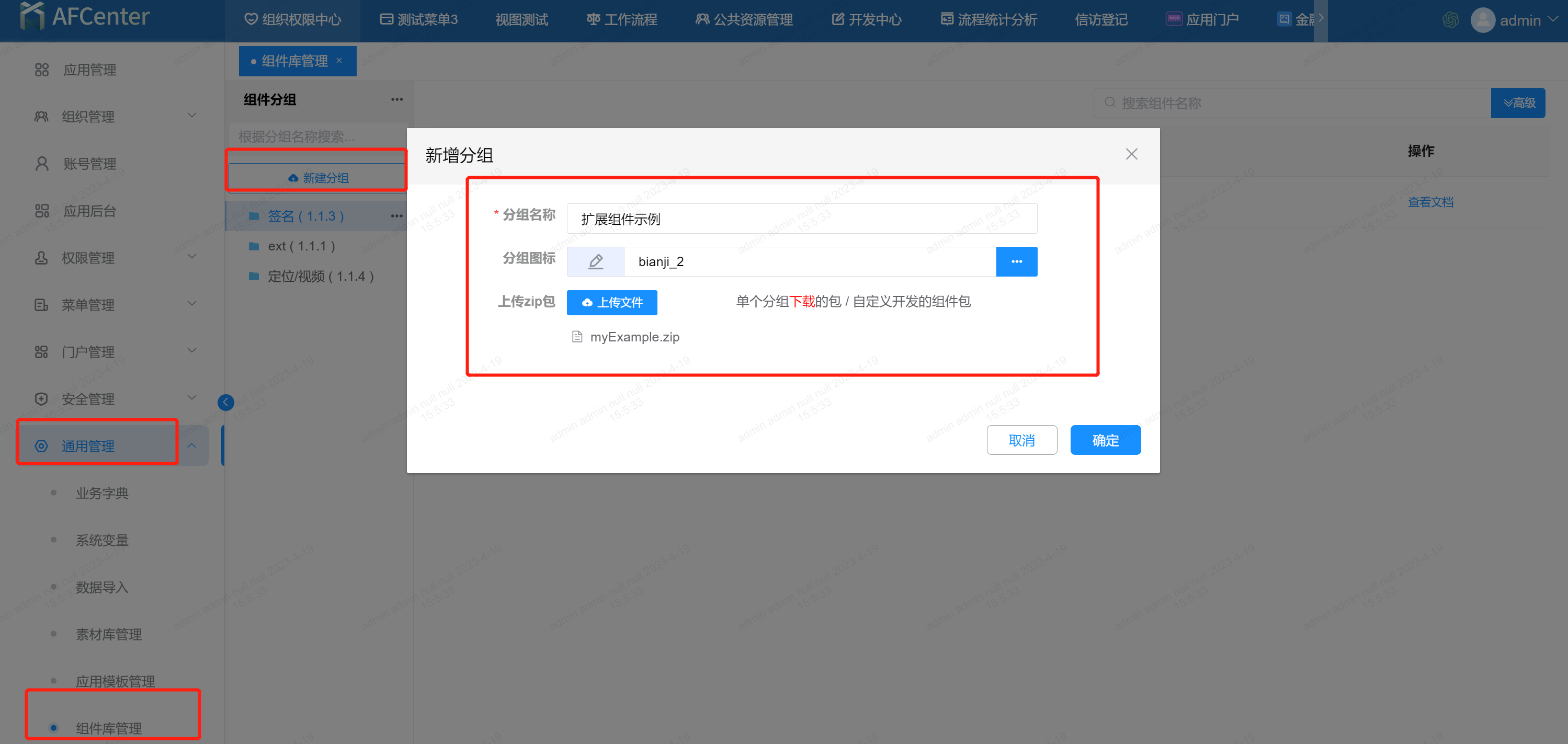在组件库上传扩展组件基础开发的zip文件,确保组件库存在扩展组件信息