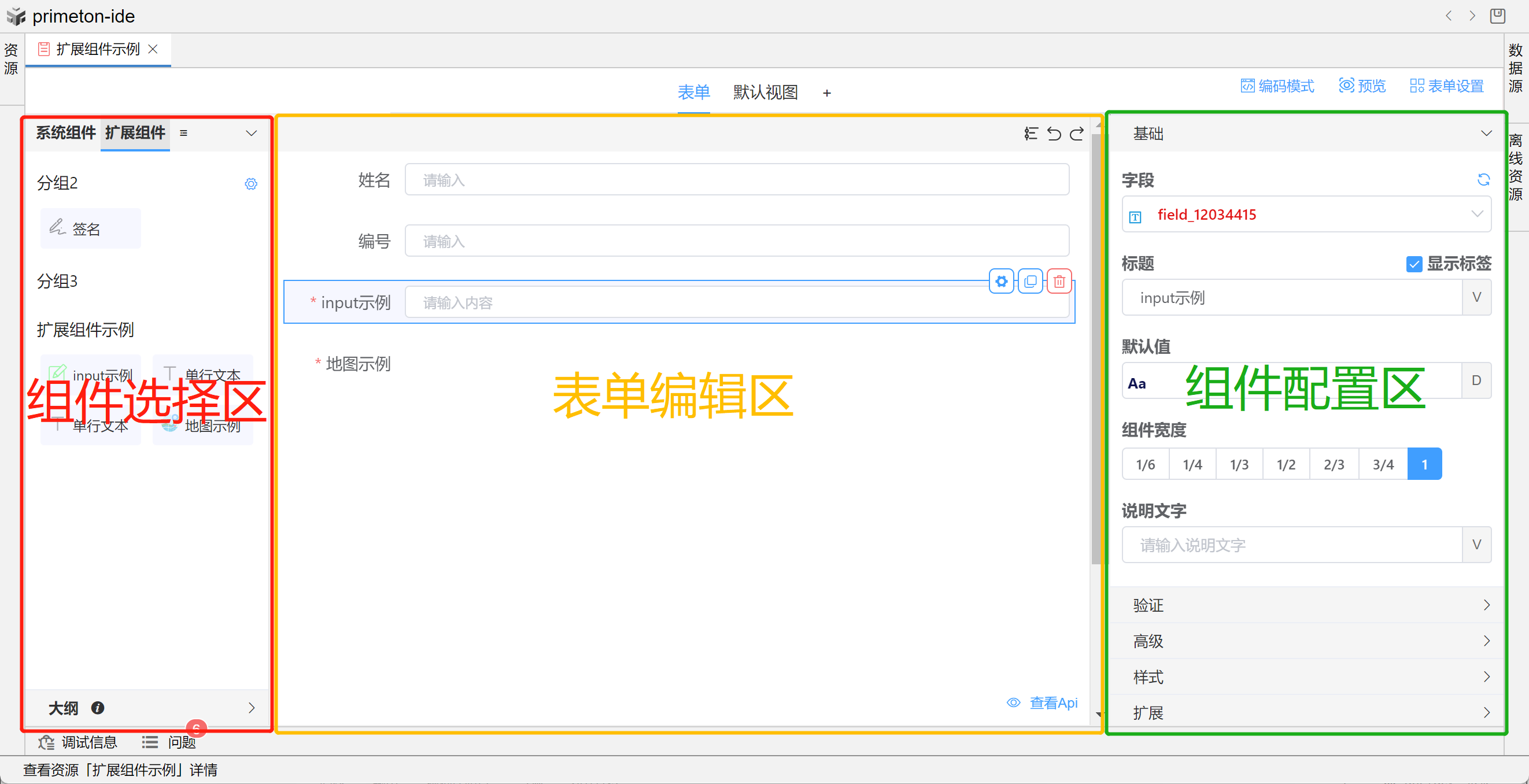 主要分为三个大部分:组件选择区,表单编辑区,组件配置区