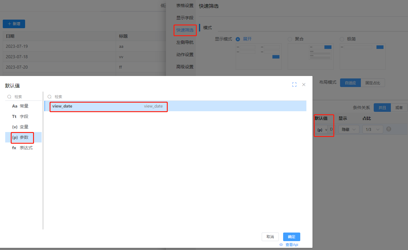 - 在视图的快速设置处,添加日期删选,默认值为参数view_date