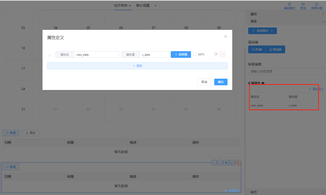 - 给默认视图传参,在扩展属性处添加view_date,如下图: