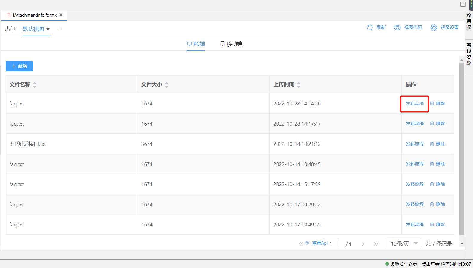 在视图中可设置自定义按钮为发起流程,按钮触发代码事件,点击时打开发起流程页面,并将当前行数据传递进流程表单中,方便流程发起。