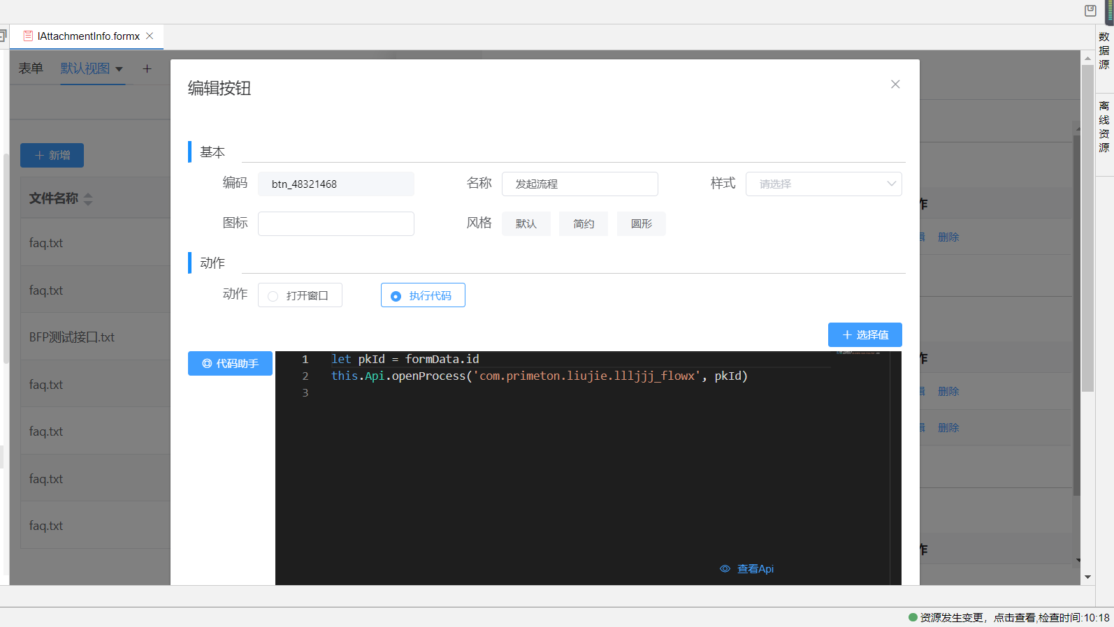 2.编辑自定义按钮,动作中点击执行代码,使用代码助手,点击打开流程,选择你当前表单所绑定的流程,点击插入代码,即可看到打开流程的js方法插入代码块中。