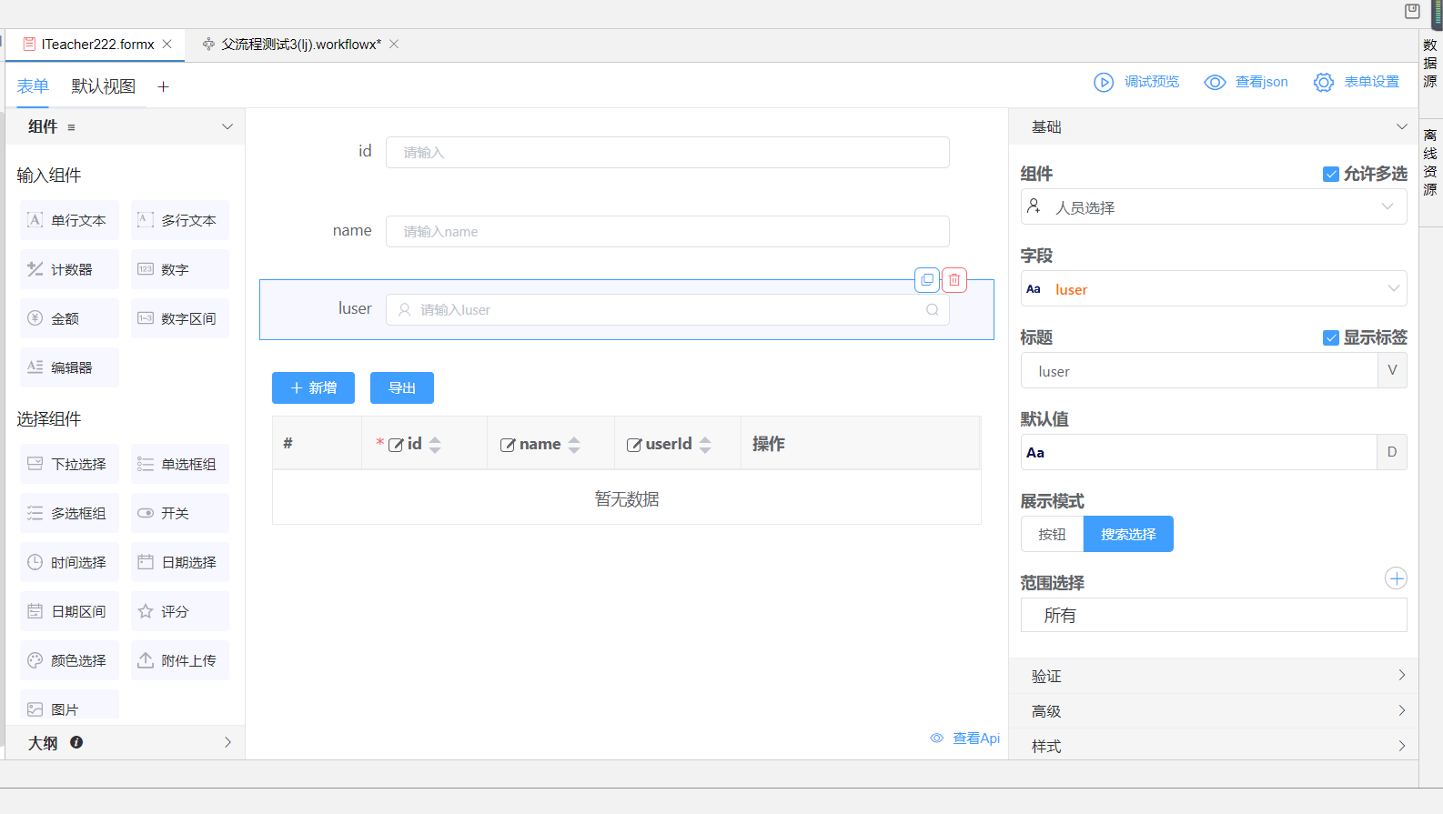 2.根据数据实体创建子流程表单页面,n端作为子流程页面,具备可以自定义选择参与者功能,需要拖动一个人员选择组件,绑定审批人字段,打开高级选项,开启流程参与者按钮。