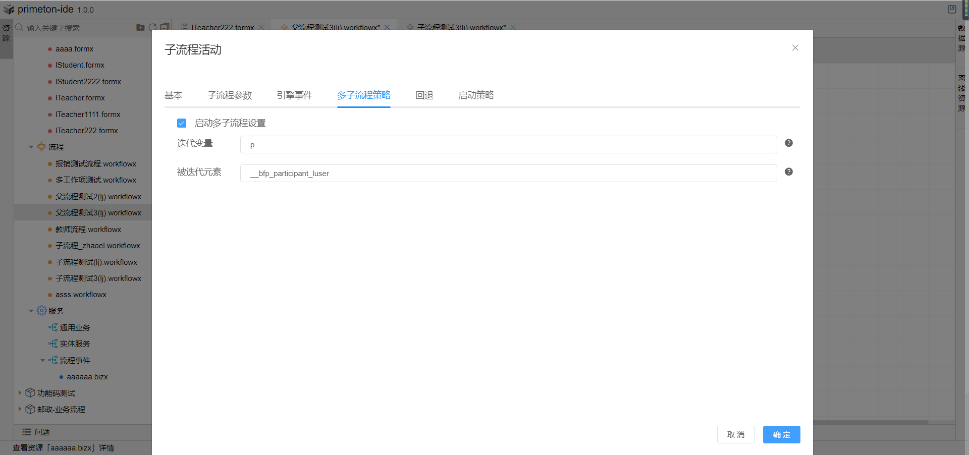 点击确认,双击子流程组件打开子流程配置,点击子流程策略配置tab页,选择启动多子流程策略,被迭代元素输入框中粘贴进父流程表单中的xpath值,迭代元素可自定义,这里定义为p。切换至子流程参数配置页,选择刚刚创建的子流程,为子流程配置参数,子流程中的id赋值当前表单实体中id值,用__bfp_entity/id表示(__bfp_entity即为表单中的formData),子流程中的__bfp_entity赋值为__bfp_entity,子流程中参数user的值为p,三个参数皆勾选回填。点击确定,保存流程即完成多子流程多任务配置。