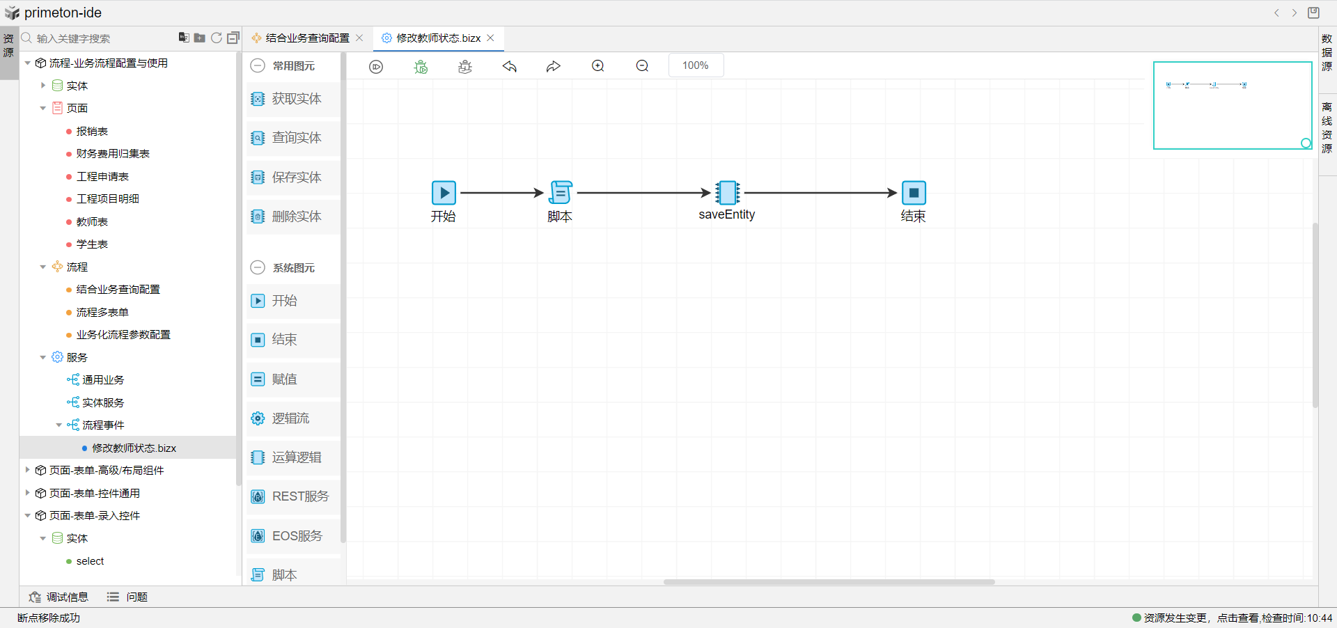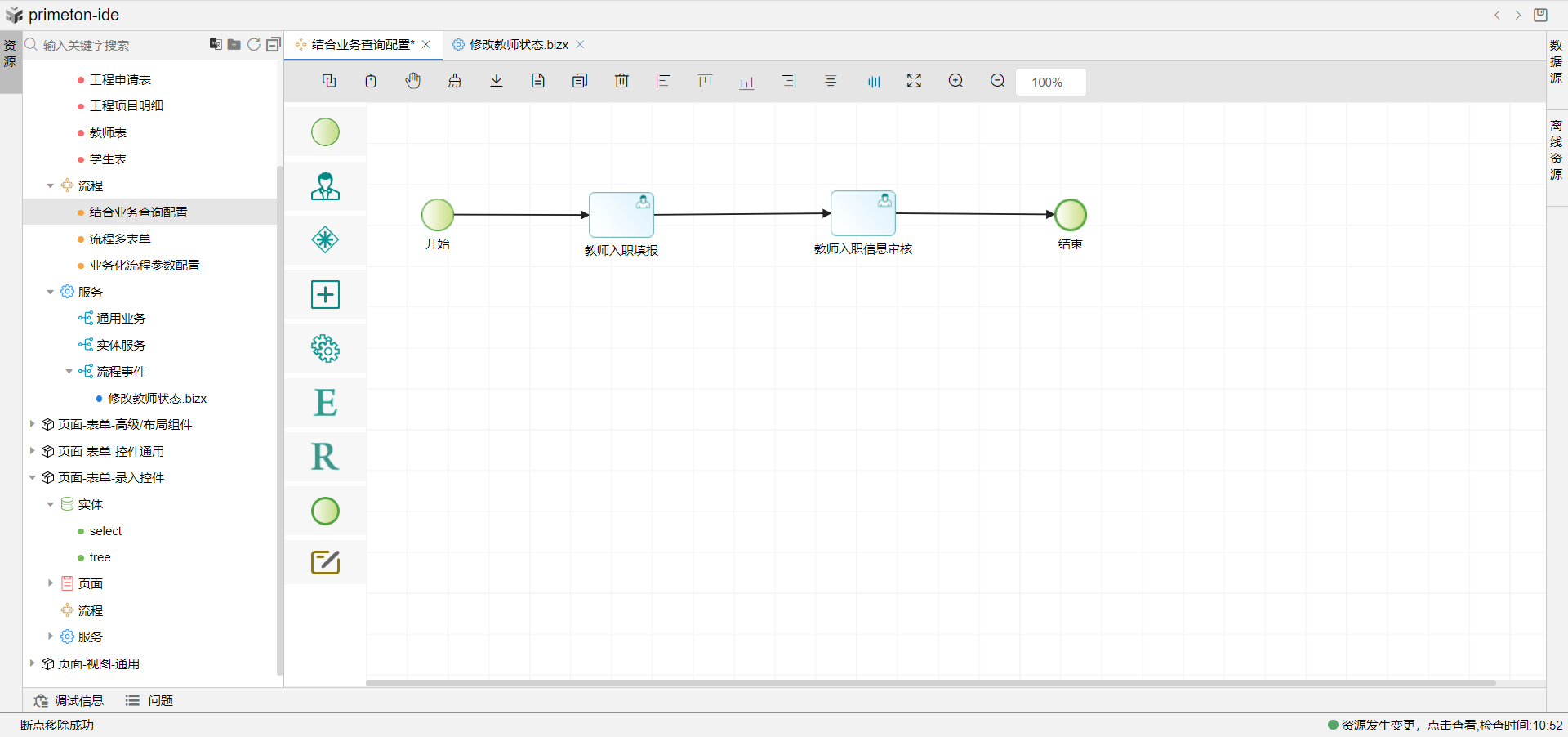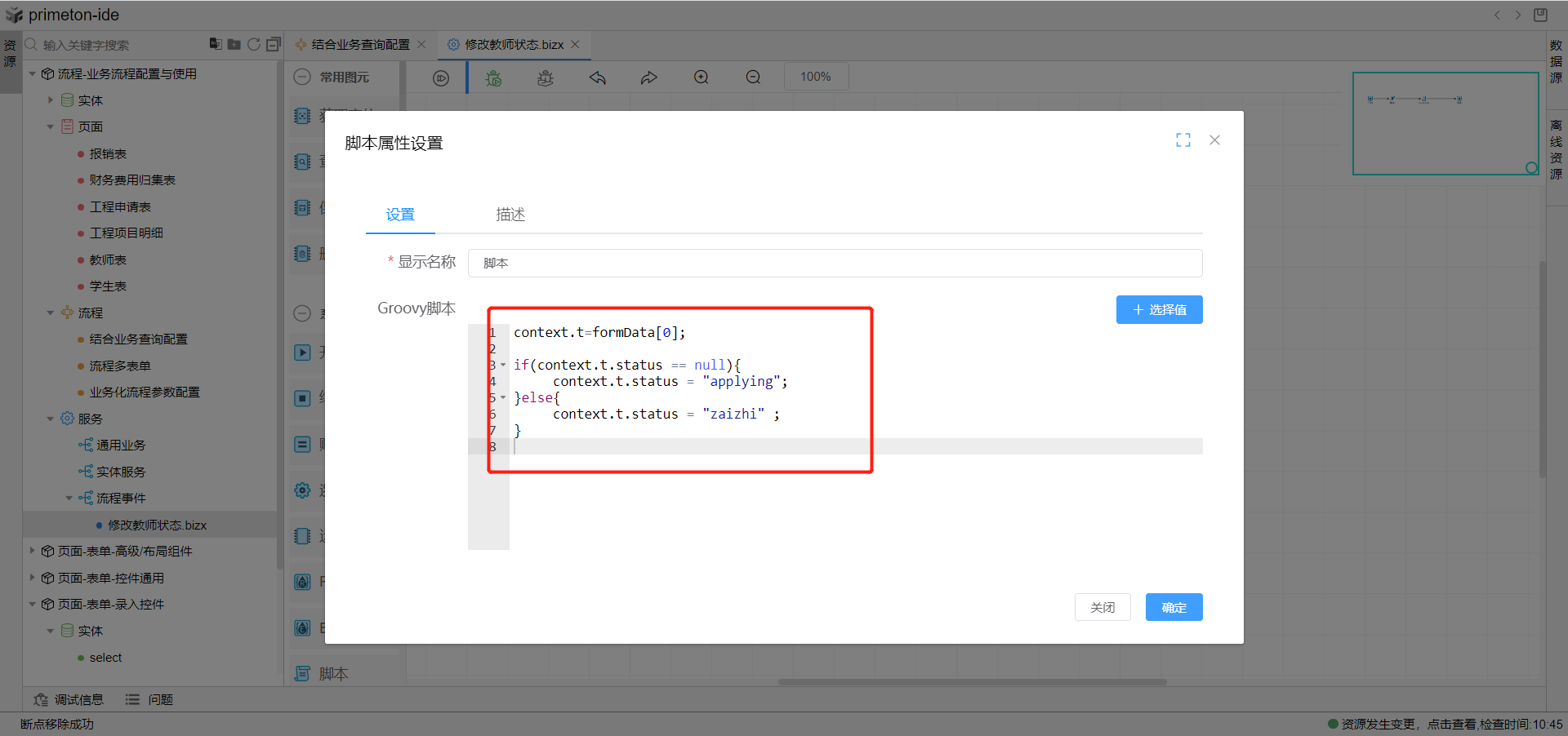 3.下方每个节点可以选配业务字典的值,配置完成后,保存流程,提交相应节点就可以按照节点配置修改教师状态的值。