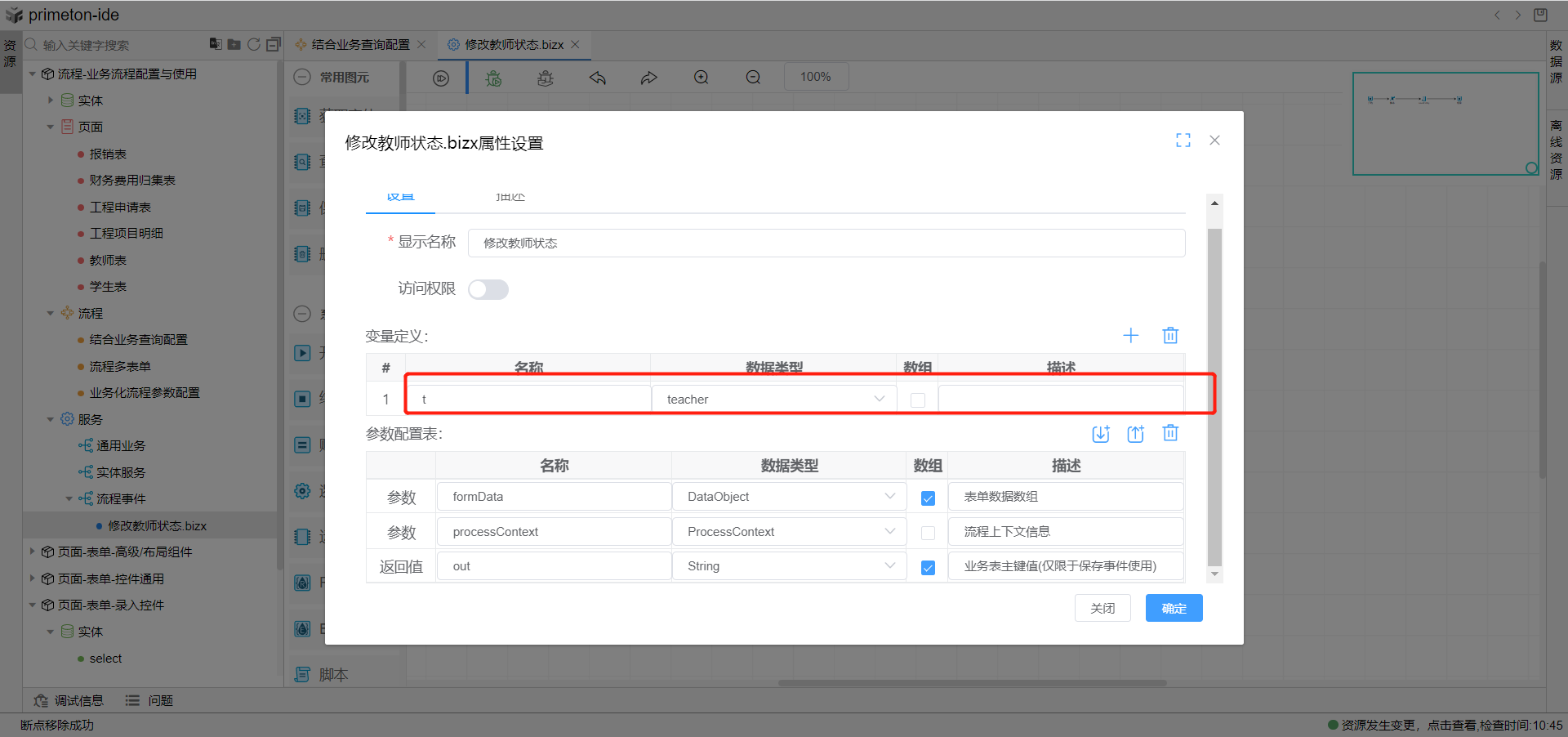 1.创建流程事件逻辑流,双击空白面板。定义流程表单绑定实体参数变量,这里设置变量t,类型为教师信息实体,参数配置表为系统默认,无需修改。